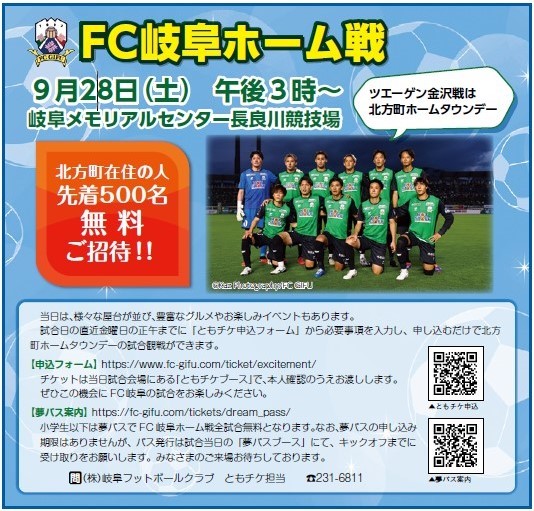 「北方町民500名様と北方町商工会会員200名様」が無料で観戦できる「感動を共にチケット」(ともチケ)で、多くの北方町民の方、北方町商工会の方々のご来場をお待ちしています。