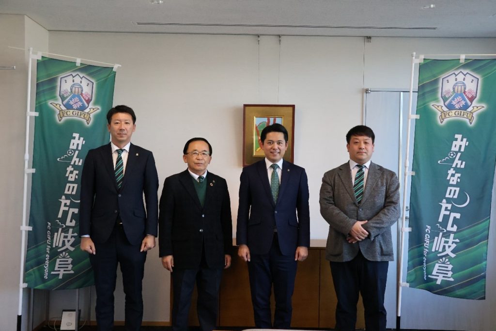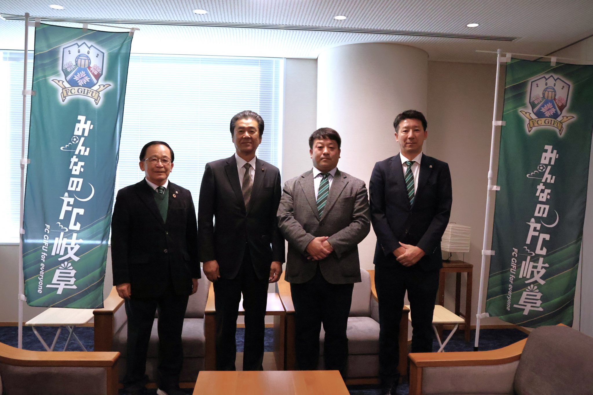 12月24日(火)に、宮田 博之 会長、小松 裕志 社長、竹元 義幸 スポーツダイレクターの3名が岐阜市役所を表敬訪問し、柴橋 正直 岐阜市長ならびに黒田 育宏 岐阜市議会議長にFC岐阜への日頃のサポートのお礼をお伝えするとともに、今シーズンの結果をご報告しました。