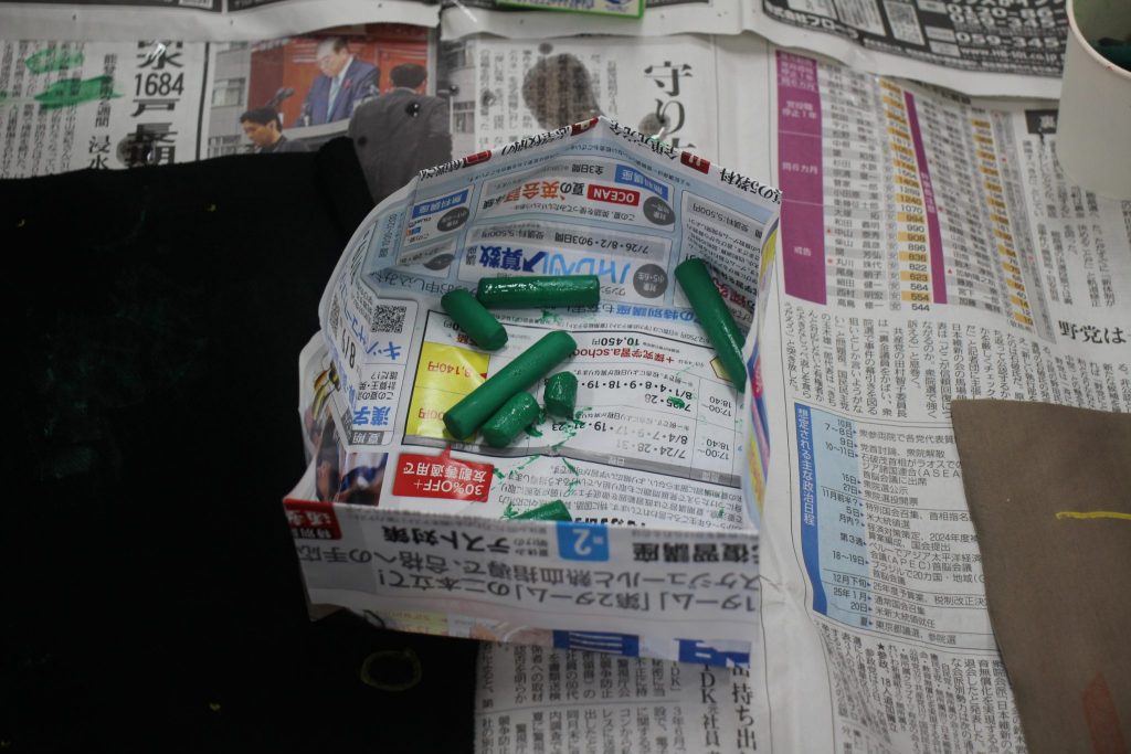 初めに、クラスごとに分かれ、回収したクレヨンの汚れを油で落としていきます。