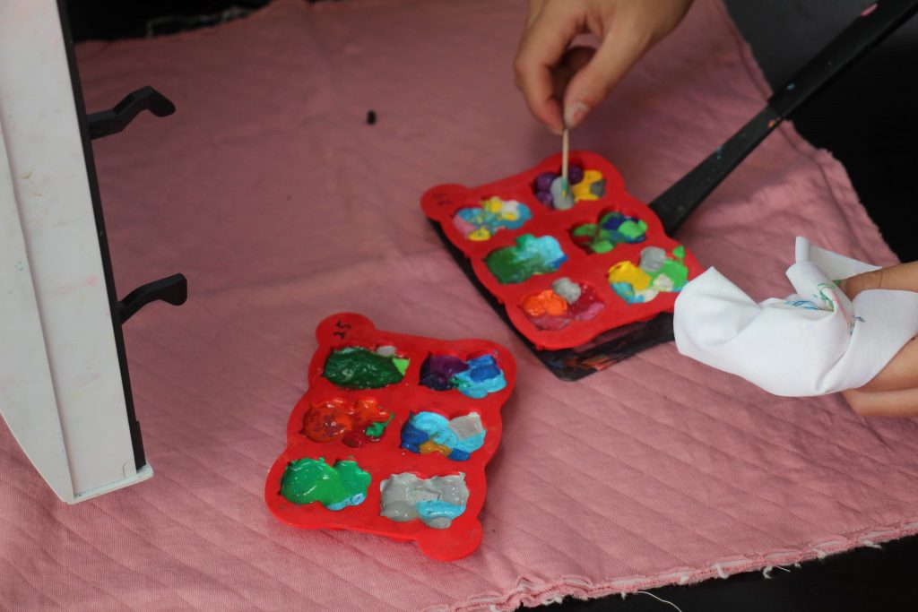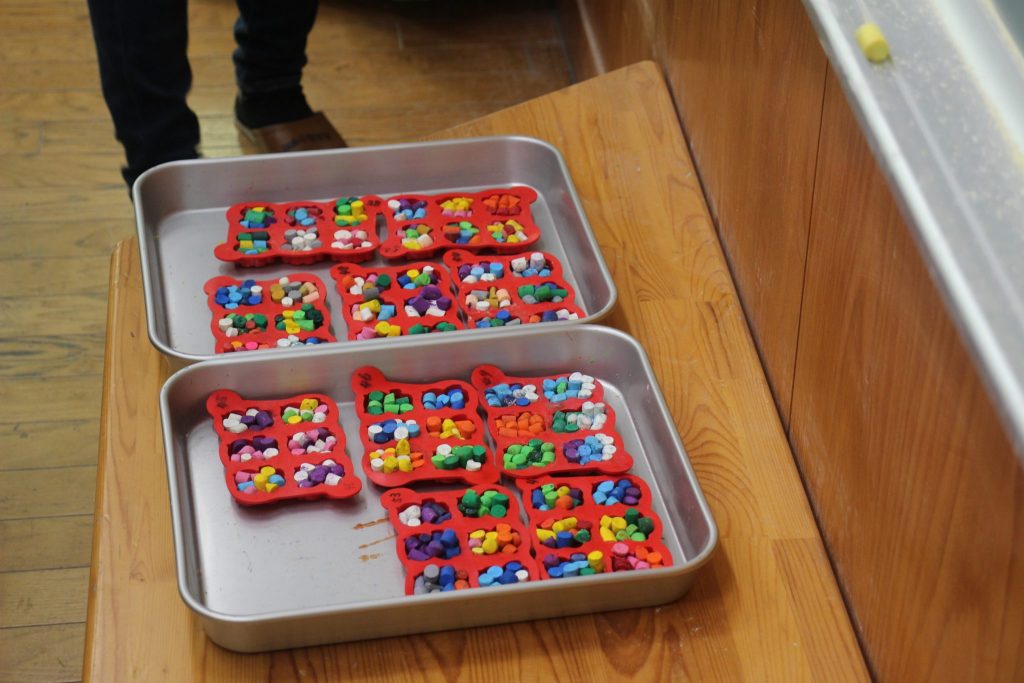 切ったクレヨンを専用の型に入れていきます。各机を回って好きな色のクレヨンを入れてカラフルにしていきます!
