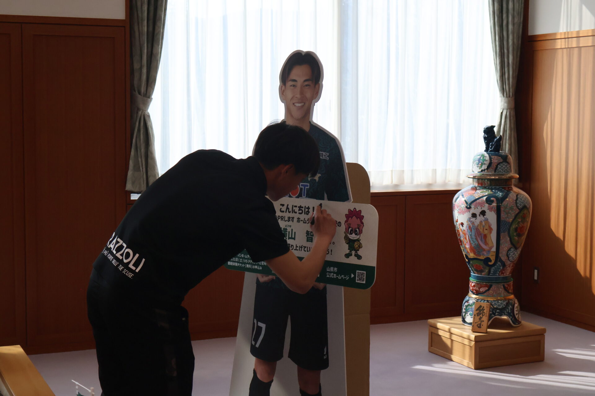 また、横山選手のサインが入った2025シーズンの等身大パネルを山県市役所の1階ロビーに展示させていただきました。
