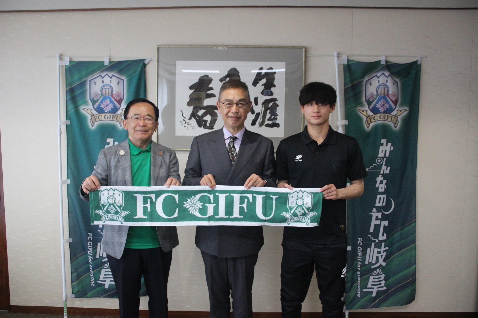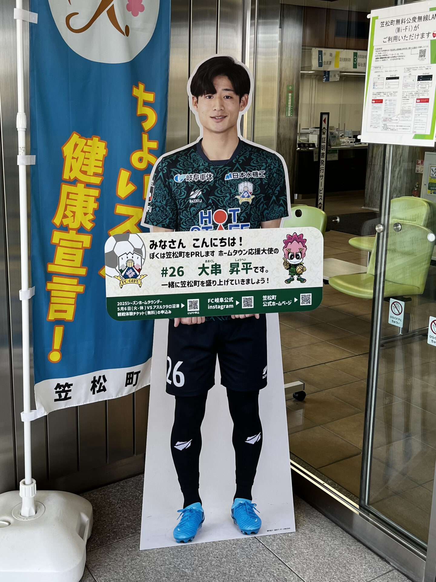 また、笠松町ホームタウン応援大使 大串昇平選手 (DF ニックネーム:ぐし、しょうへい) の応援パネルを笠松町役場正面入口に設置しています。