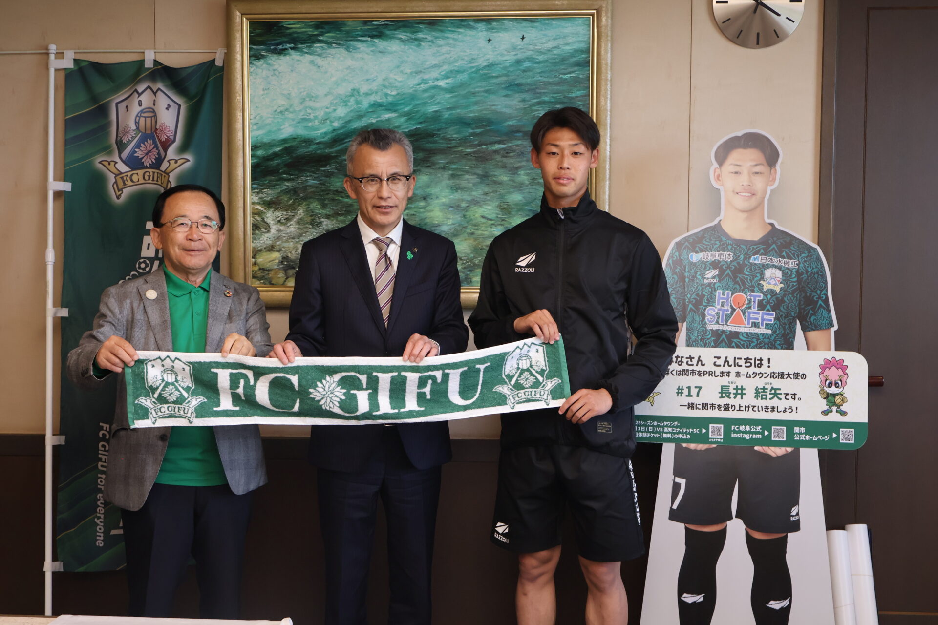 6月1日(日)高知ユナイテッドSC戦での「関市ホームタウンデー」開催にあたり、4月23日(水)に宮田博之会長、長井結矢選手が関市役所を訪問し、山下清司関市長を表敬しました。