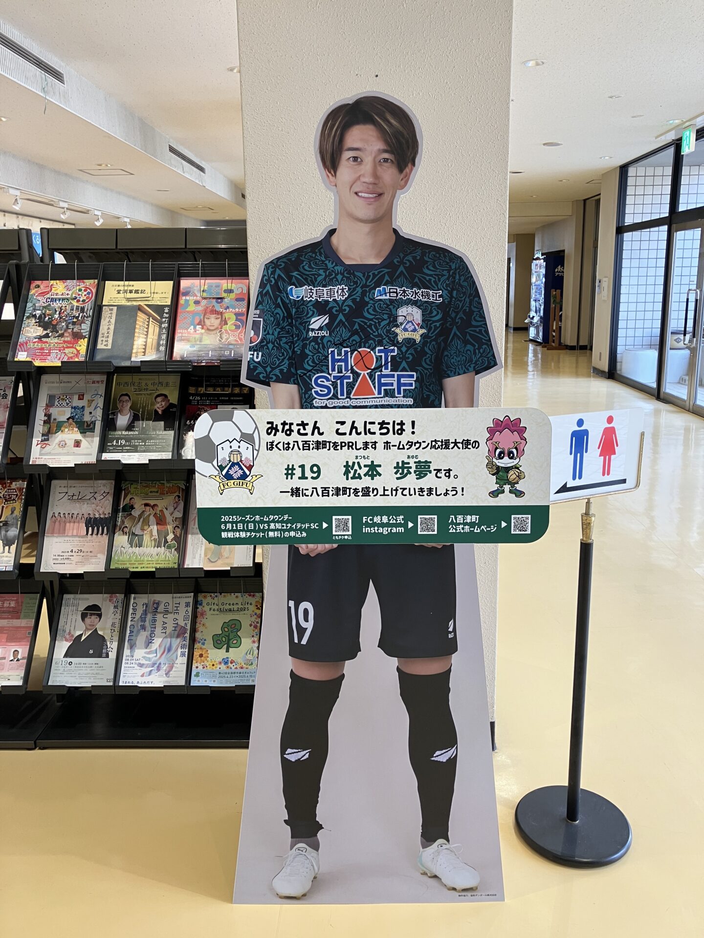 八百津町ホームタウン応援大使 松本歩夢選手 (DF ニックネーム:あゆ) の応援パネルを中央公民館1階広場に設置しています。
