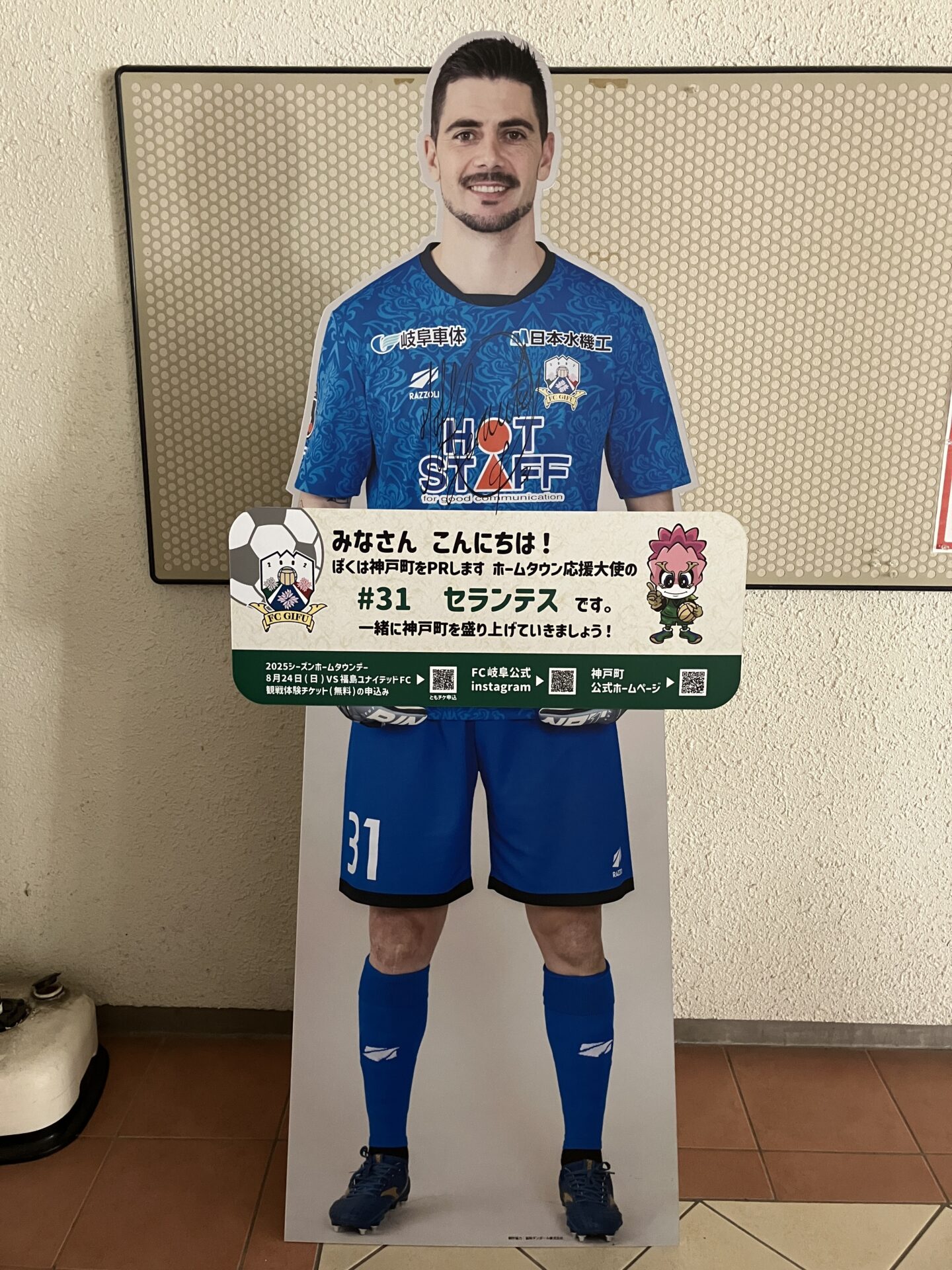 神戸町ホームタウン応援大使 セランテス選手 (GK ニックネーム:ジョン) の応援パネルを神戸町民体育館に設置しています。