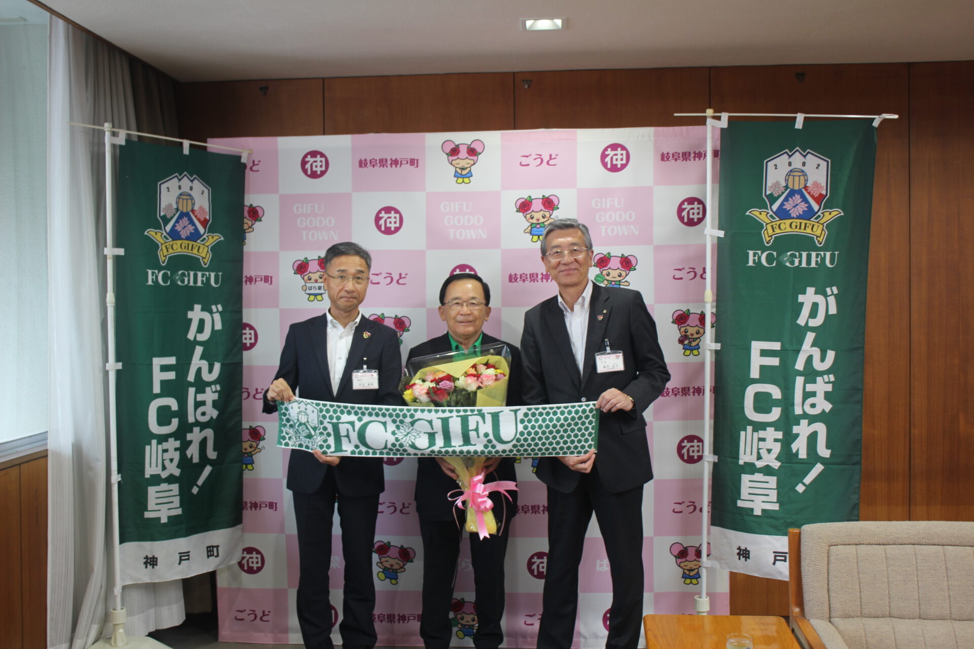 藤井町長へ日頃の応援への感謝をお伝えし、これからも多くの神戸町の皆さんに来場いただき、応援してもらいたいとお願いしました。