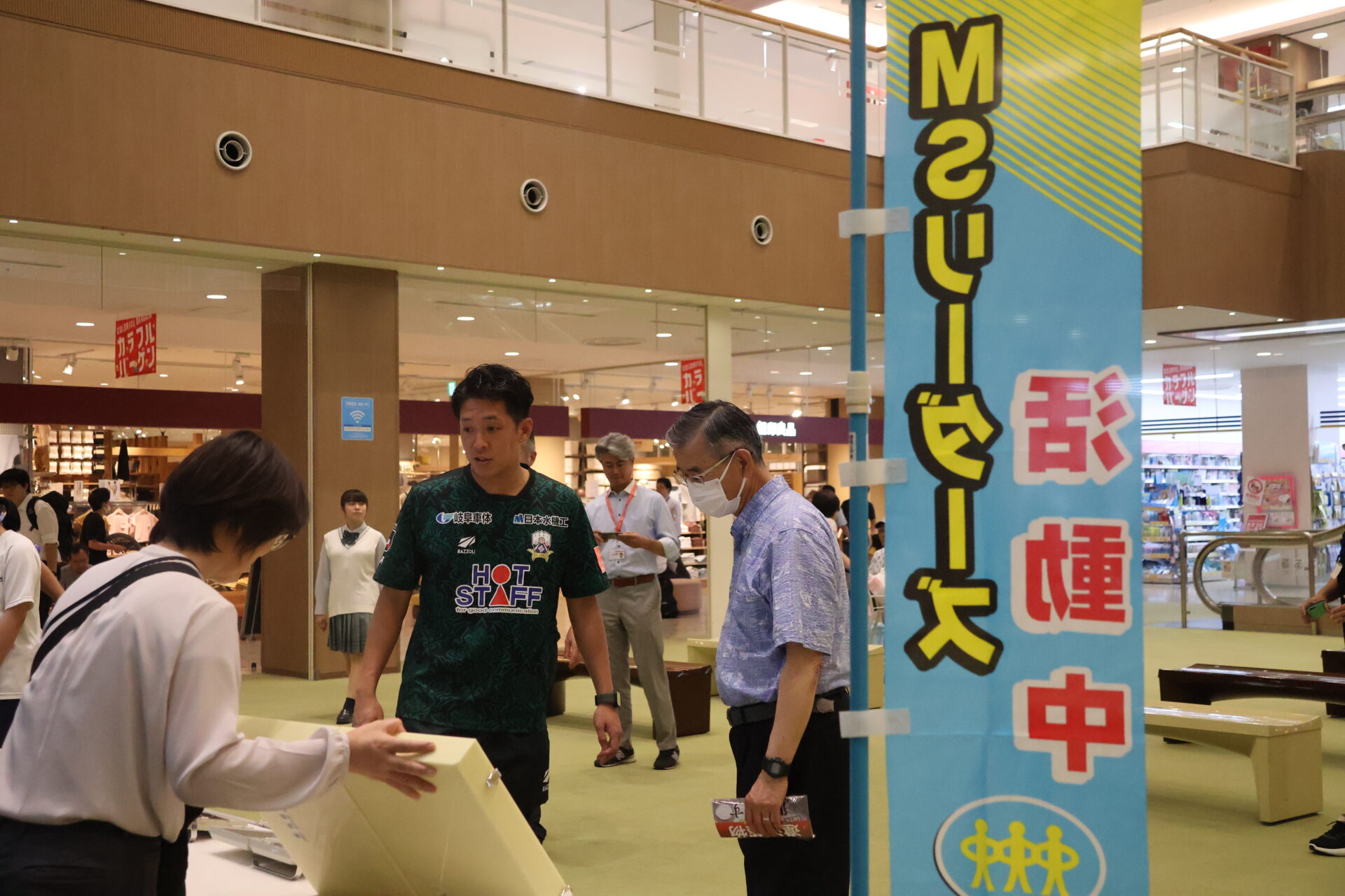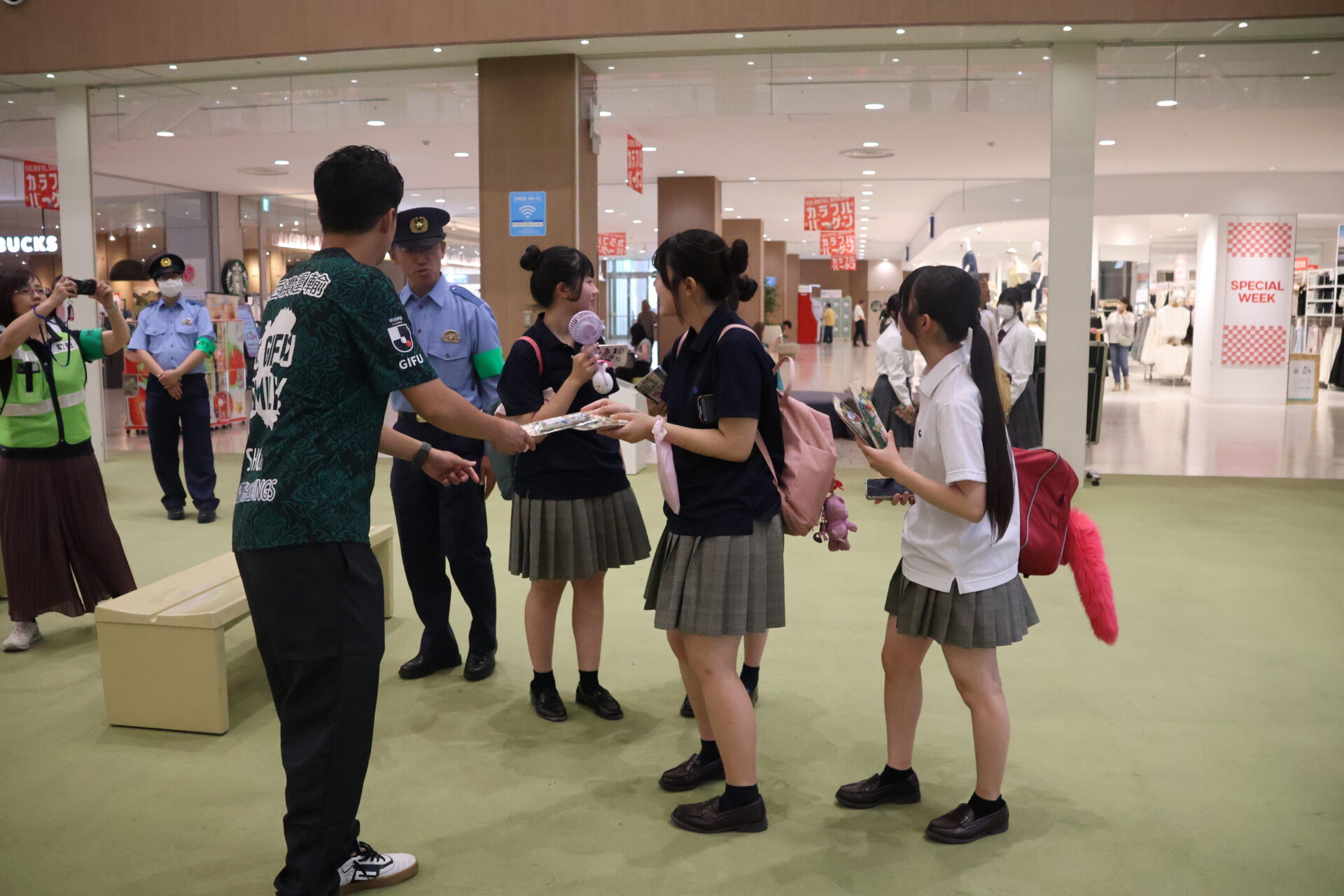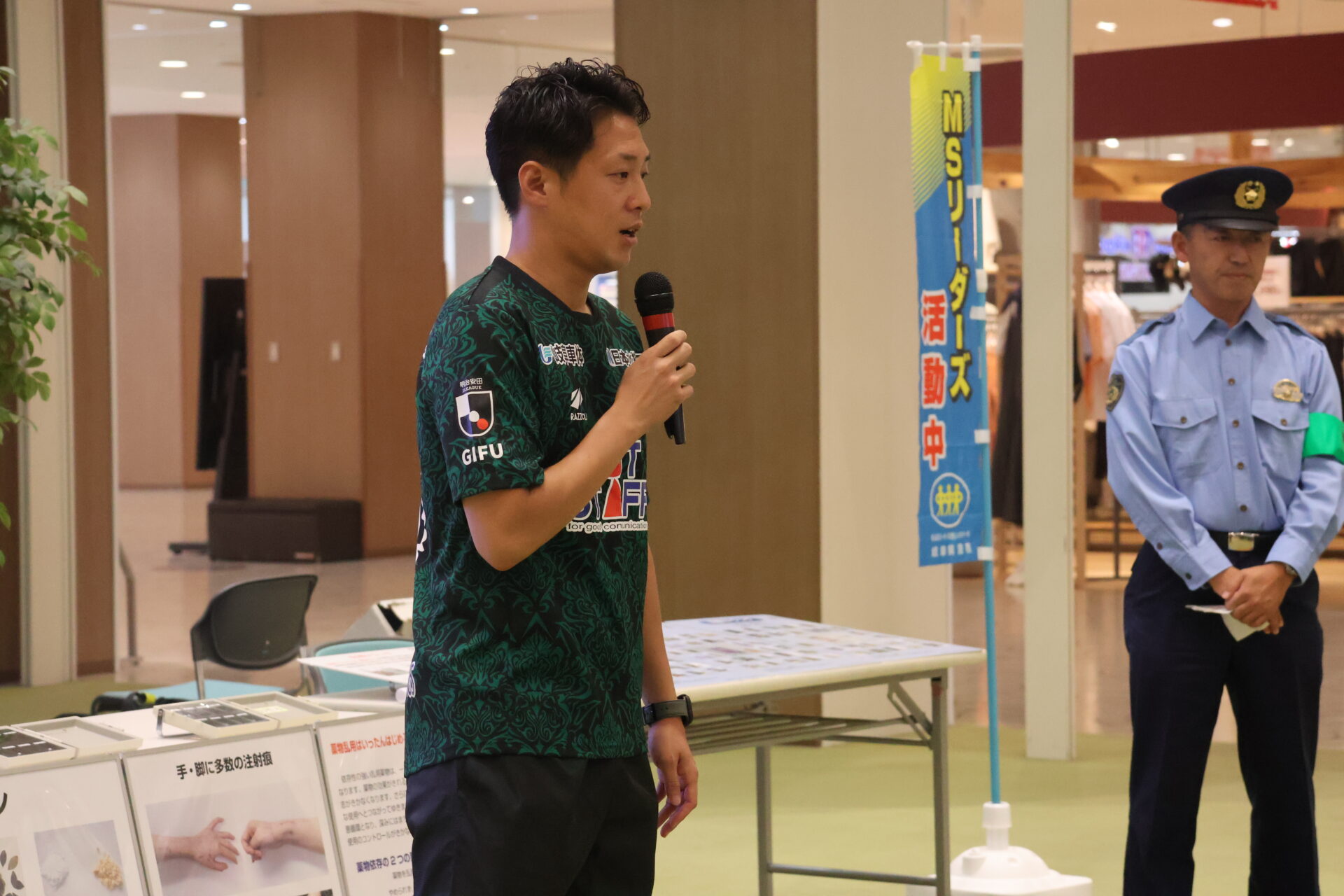 令和7年度「青少年の被害・非行防止全国強調月間」に合わせ、7月1日(火)に岐阜市の「カラフルタウン岐阜 カラフルパーク」にて行われた非行防止広報啓発活動に庄司悦大さん(元FC岐阜選手、現営業担当兼スクールコーチ) が応援に駆け付けました。