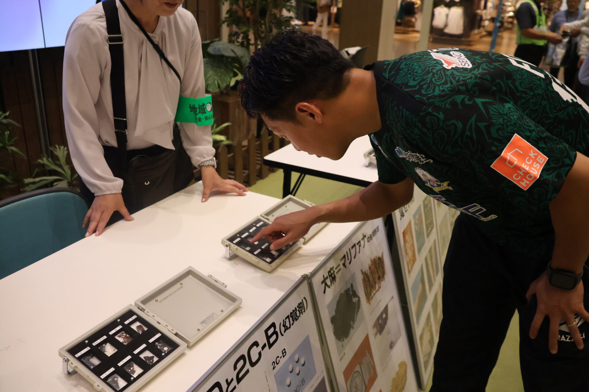 薬物見本の展示で危険性をお勉強!! 真剣なまなざしの庄司さん