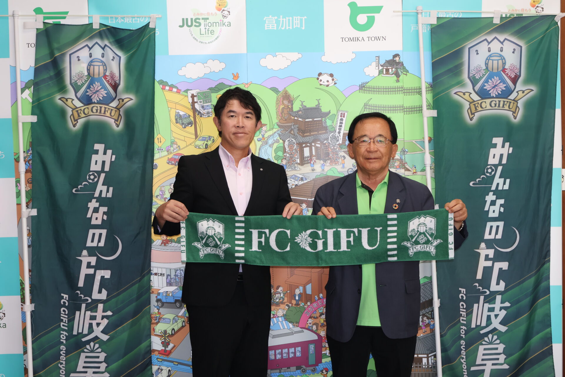 8月30日(土)FC琉球戦での「富加町ホームタウンデー」開催にあたり、7月11日(金)に宮田博之会長が富加町役場を訪問し、渡邉圭太富加町長を表敬訪問しました。