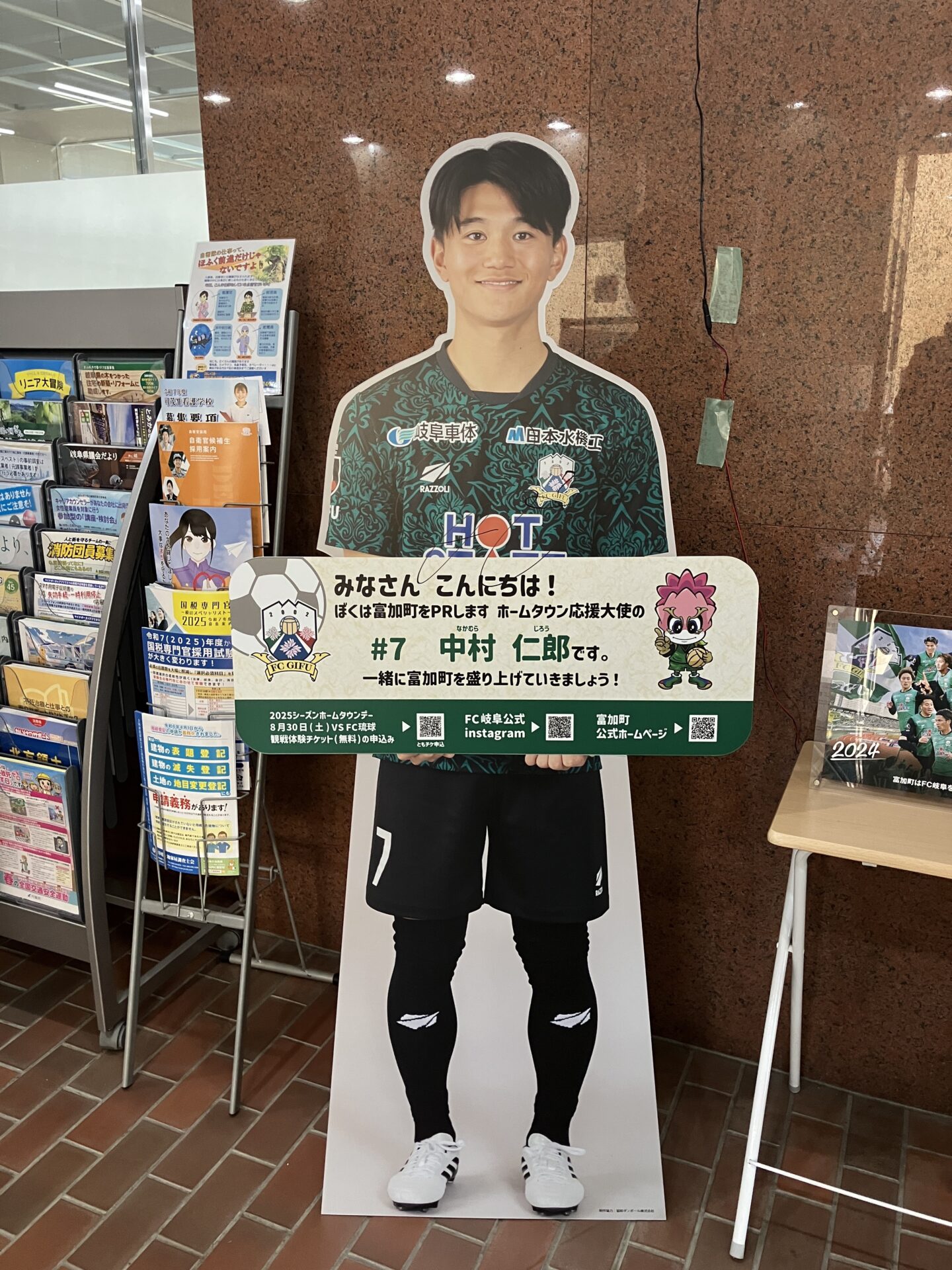 富加町ホームタウン応援大使 中村仁郎選手 (MF ニックネーム:じんじん) の応援パネルを富加町役場に設置しています。