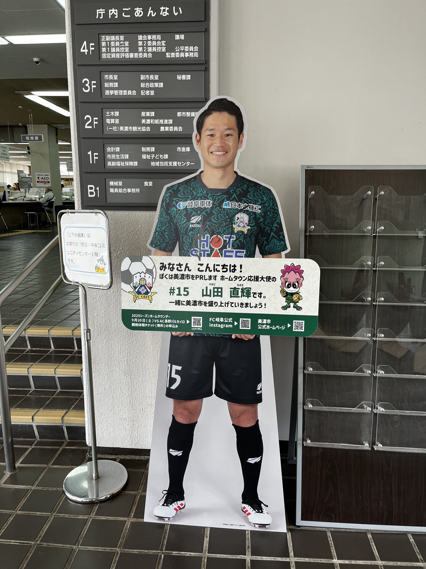 美濃市ホームタウン応援大使 山田直輝選手 (MF ニックネーム:やーまん) の応援パネルを美濃市役所に設置しています。