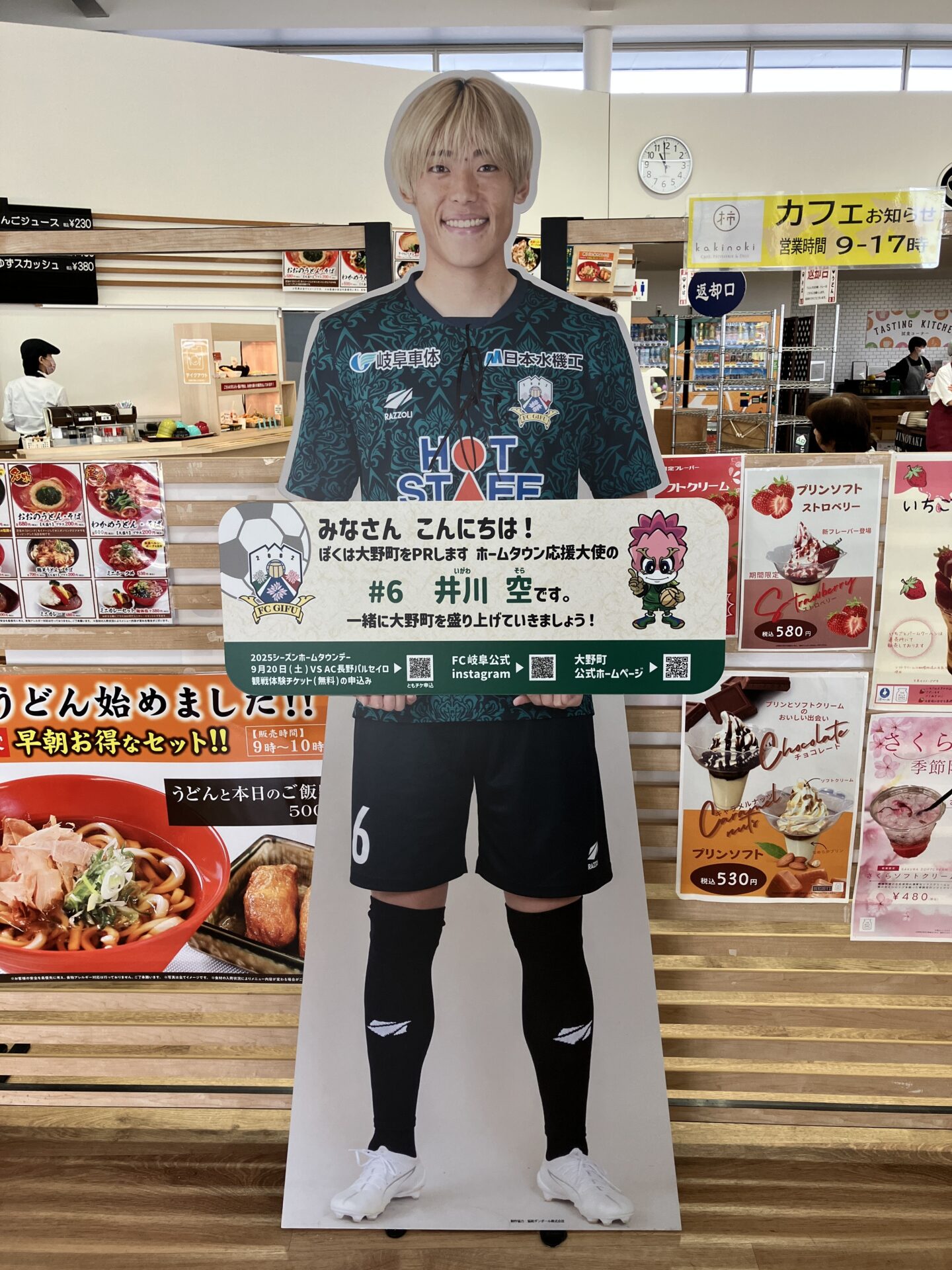 大野町ホームタウン応援大使 井川空選手 (MF ニックネーム:そら) の応援パネルをパレットピアおおのに設置しています。