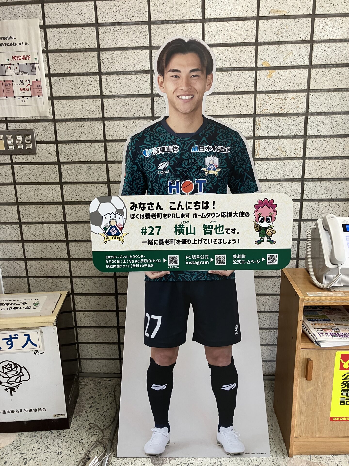 養老町ホームタウン応援大使の横山智也選手 (FW ニックネーム:ヨコ) の応援パネルを養老町役場に設置しています。