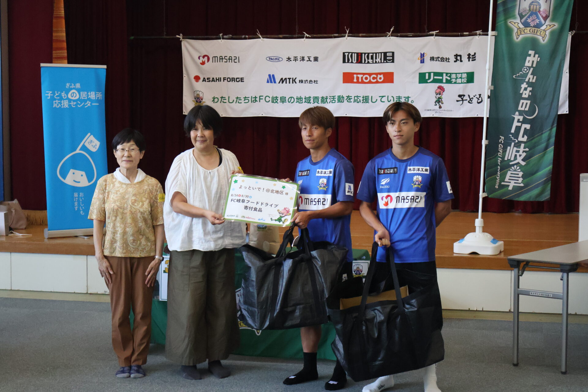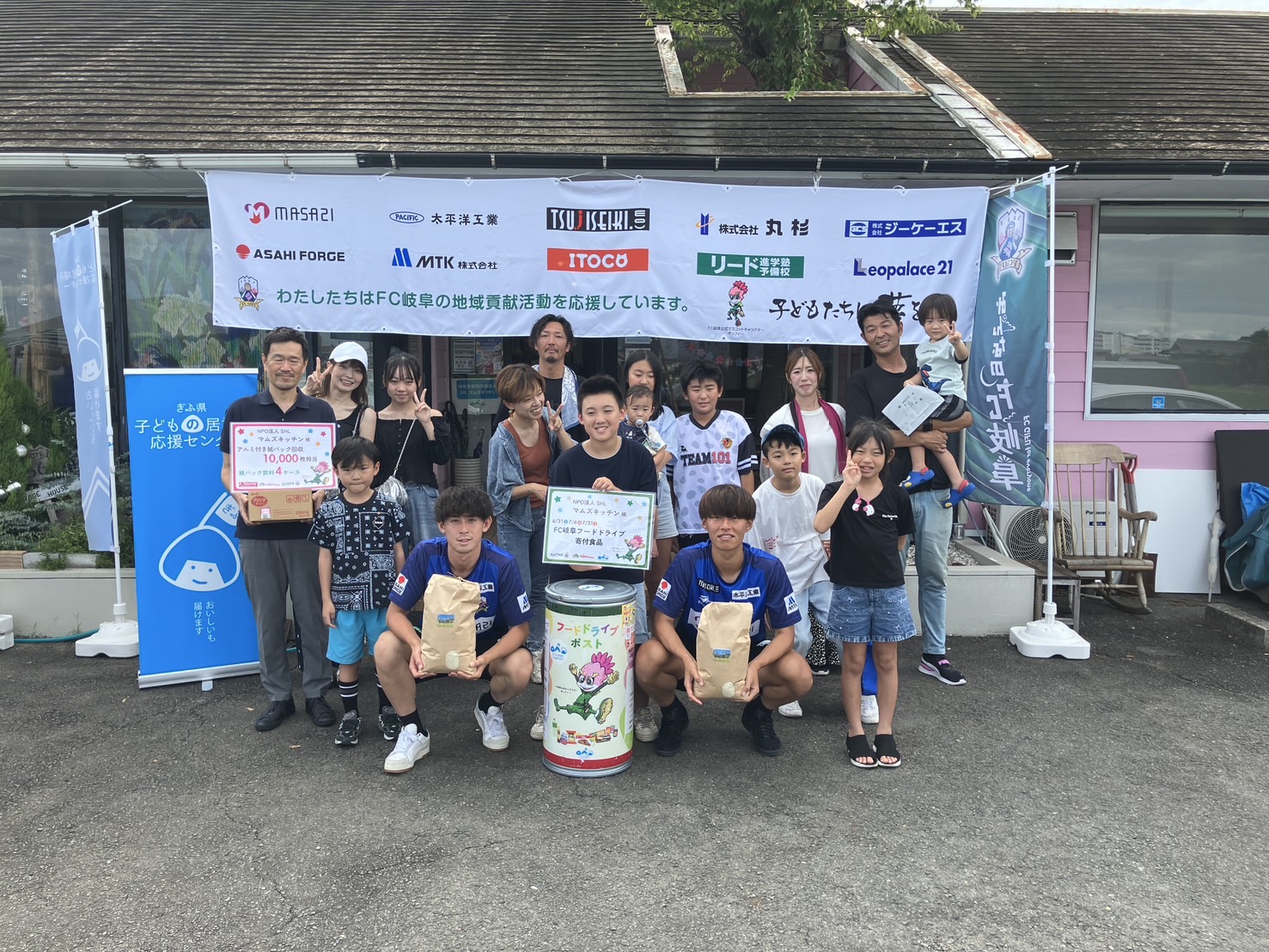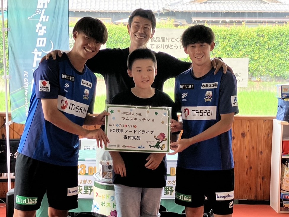 FC岐阜では、ホームゲーム会場にて実施している「フードドライブ」で集まった食品を、選手が子ども食堂へ直接届け、子どもたちと交流する活動を行っています。