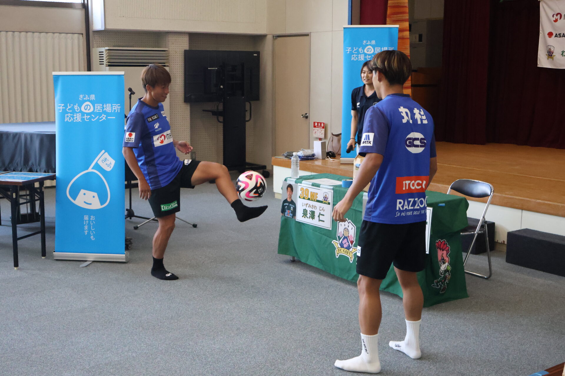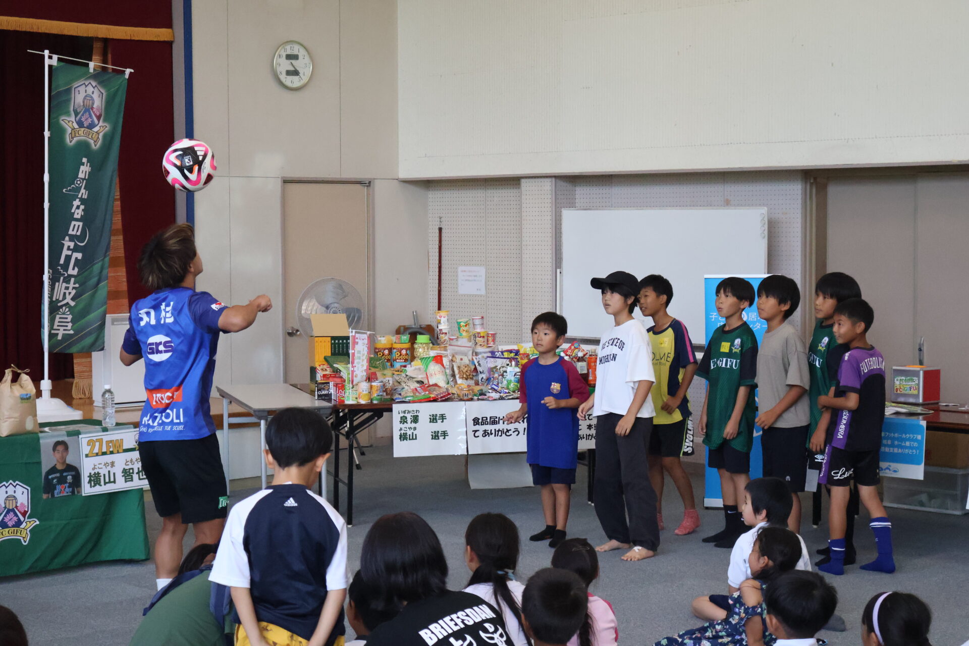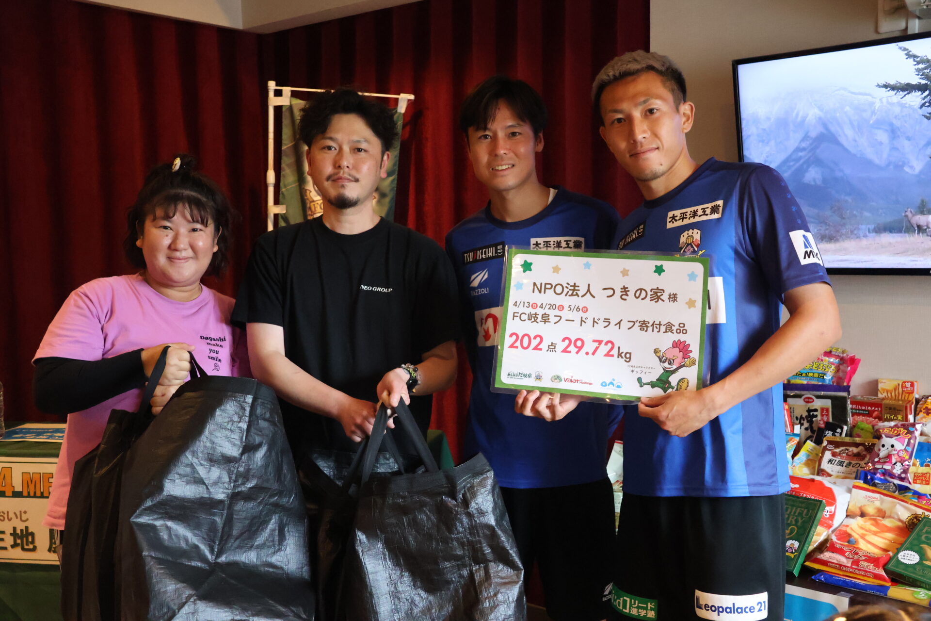 FC岐阜では、ホームゲーム会場にて実施している「フードドライブ」で集まった食品を、選手が子ども食堂へ直接届け、子どもたちと交流する活動を行っています。