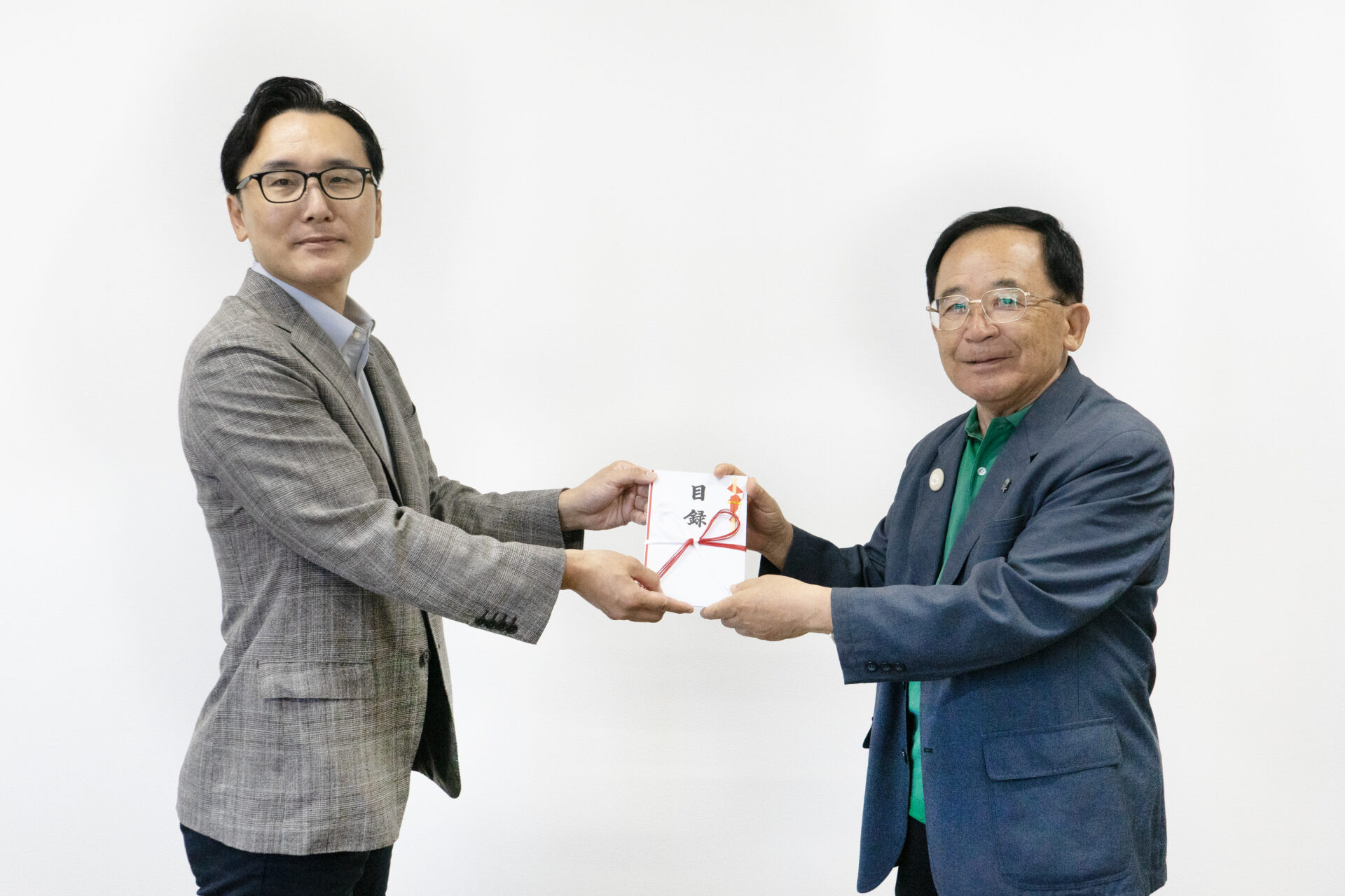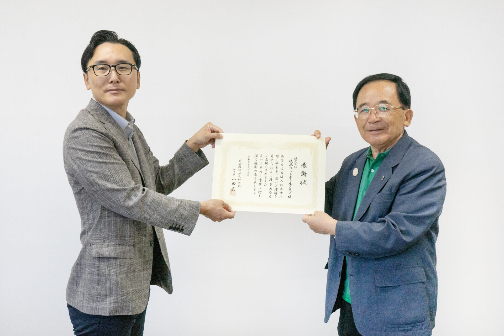 宮田会長から山田豪理事長に対してお米の目録をお渡し、山田理事長からは感謝状を頂戴いたしました。