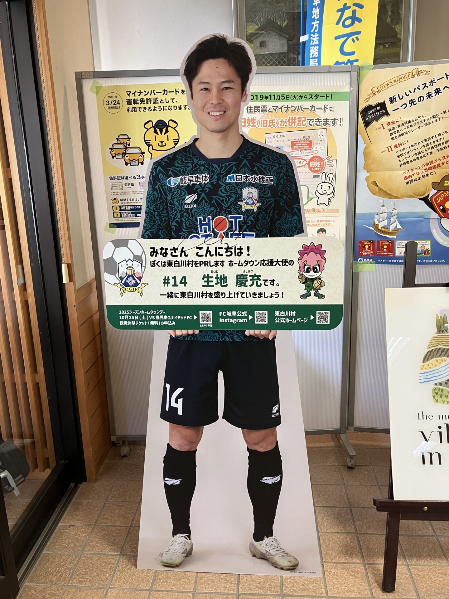 東白川村ホームタウン応援大使の生地 慶充選手 (MF ニックネーム:おいちゃん) の応援パネルを東白川村役場に設置しています。