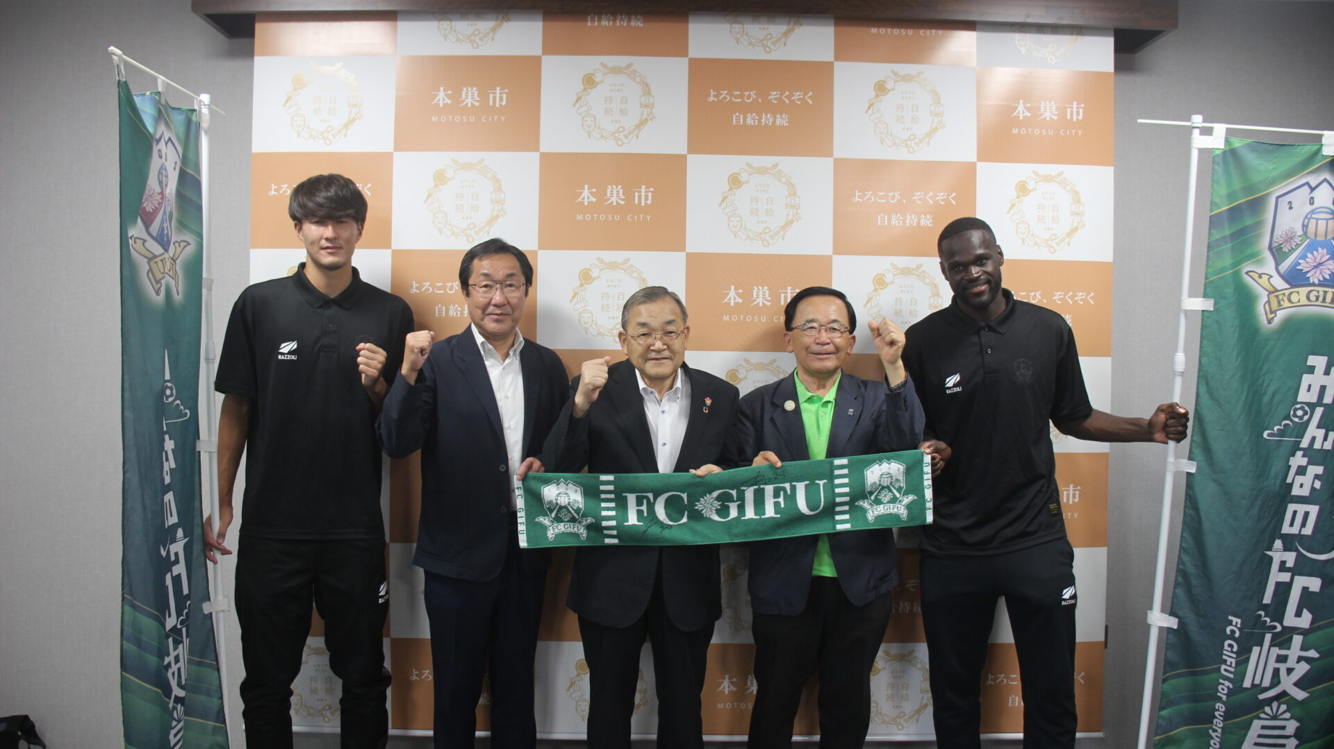 11月9日(日) ガイナーレ鳥取戦での「本巣市ホームタウンデー」開催にあたり、9月24日(水)に宮田博之会長、加藤 慎太郎選手、ブヴィク ムシティ オコ選手が本巣市役所を訪問し、藤原勉本巣市長を表敬訪問しました。