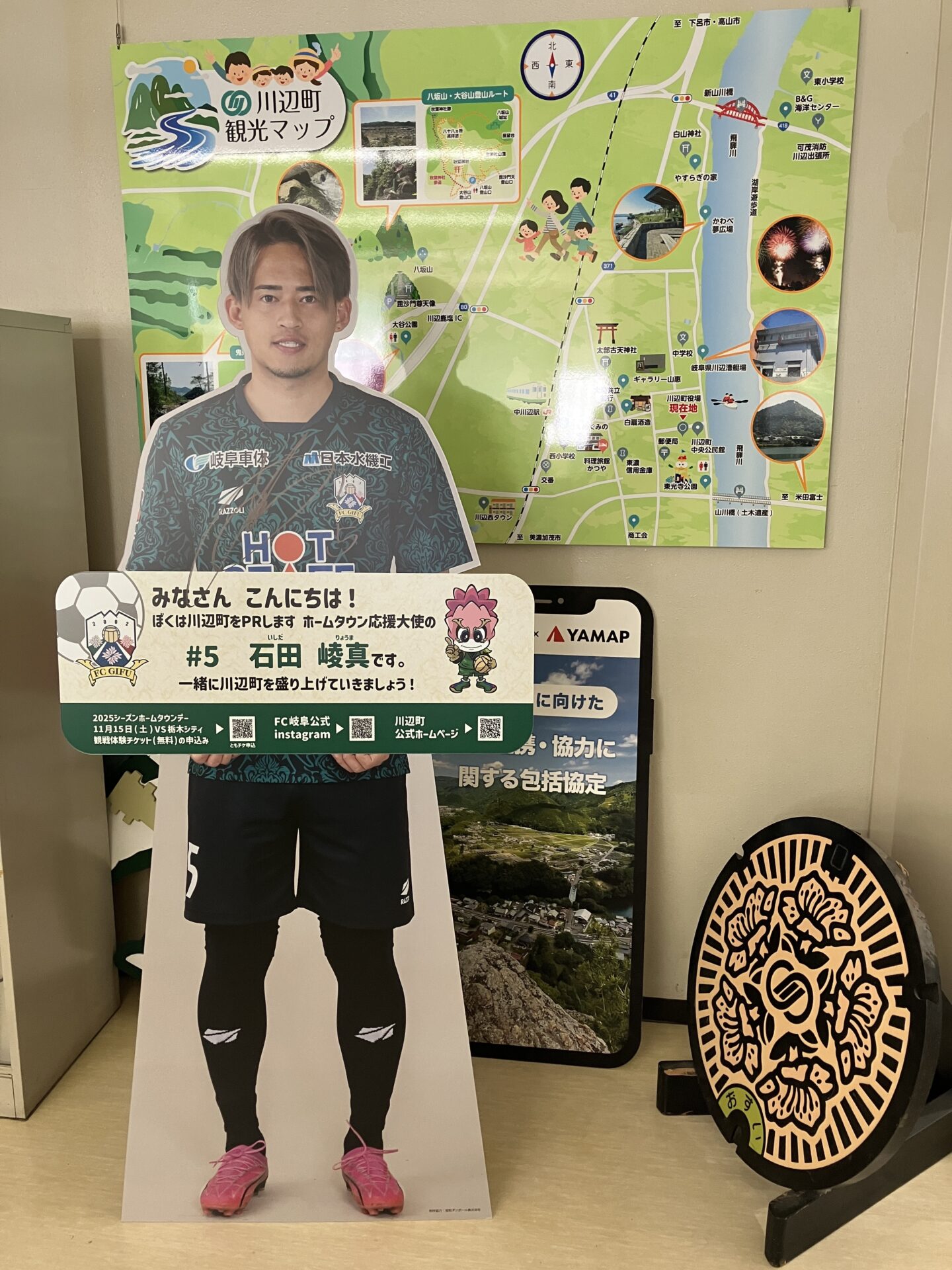 川辺町ホームタウン応援大使の石田崚真選手 (DF ニックネーム:いし) の応援パネルを川辺町B&G海洋センターに設置しています。