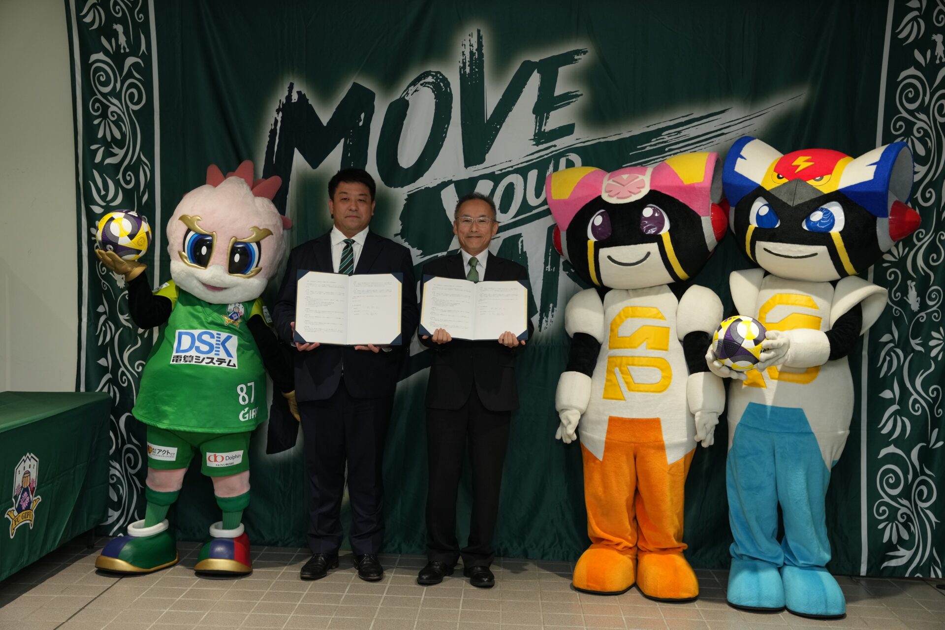 締結にあたり、10月4日(土) ザスパ群馬戦において、岐阜県警察 早野祐之総務室長と株式会社岐阜フットボールクラブ 小松社長が協定締結の調印式を行いました。