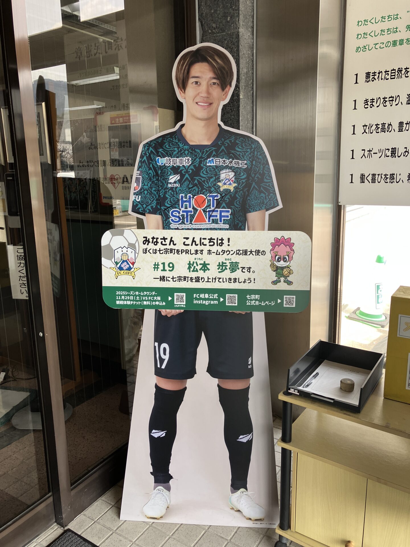 七宗町ホームタウン応援大使の松本 歩夢選手 (MF ニックネーム:あゆ) の応援パネルを七宗町役場に設置しています。