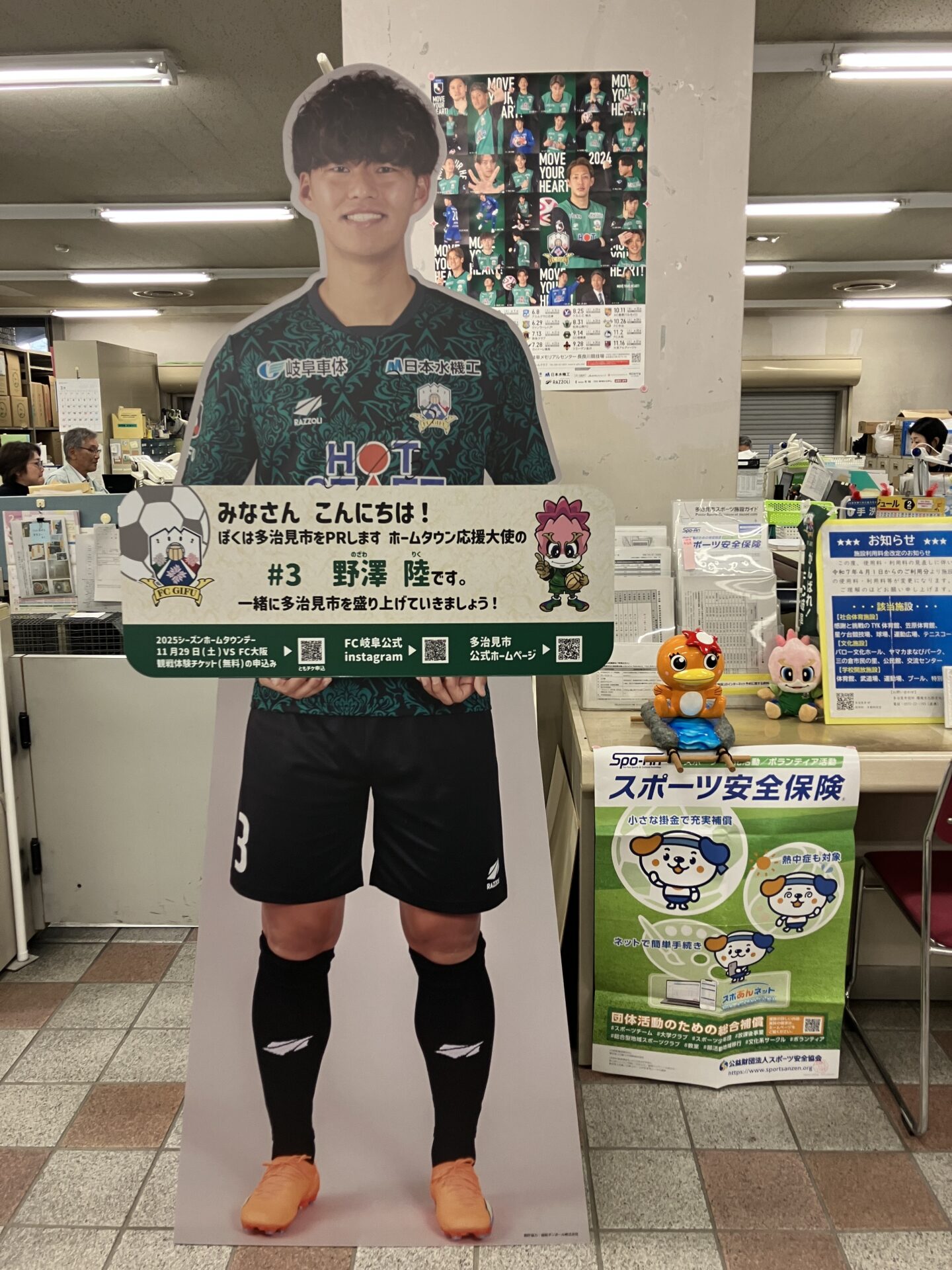 多治見市ホームタウン応援大使の野澤 陸選手 (DF ニックネーム:りく) の応援パネルを多治見市役所に設置しています。