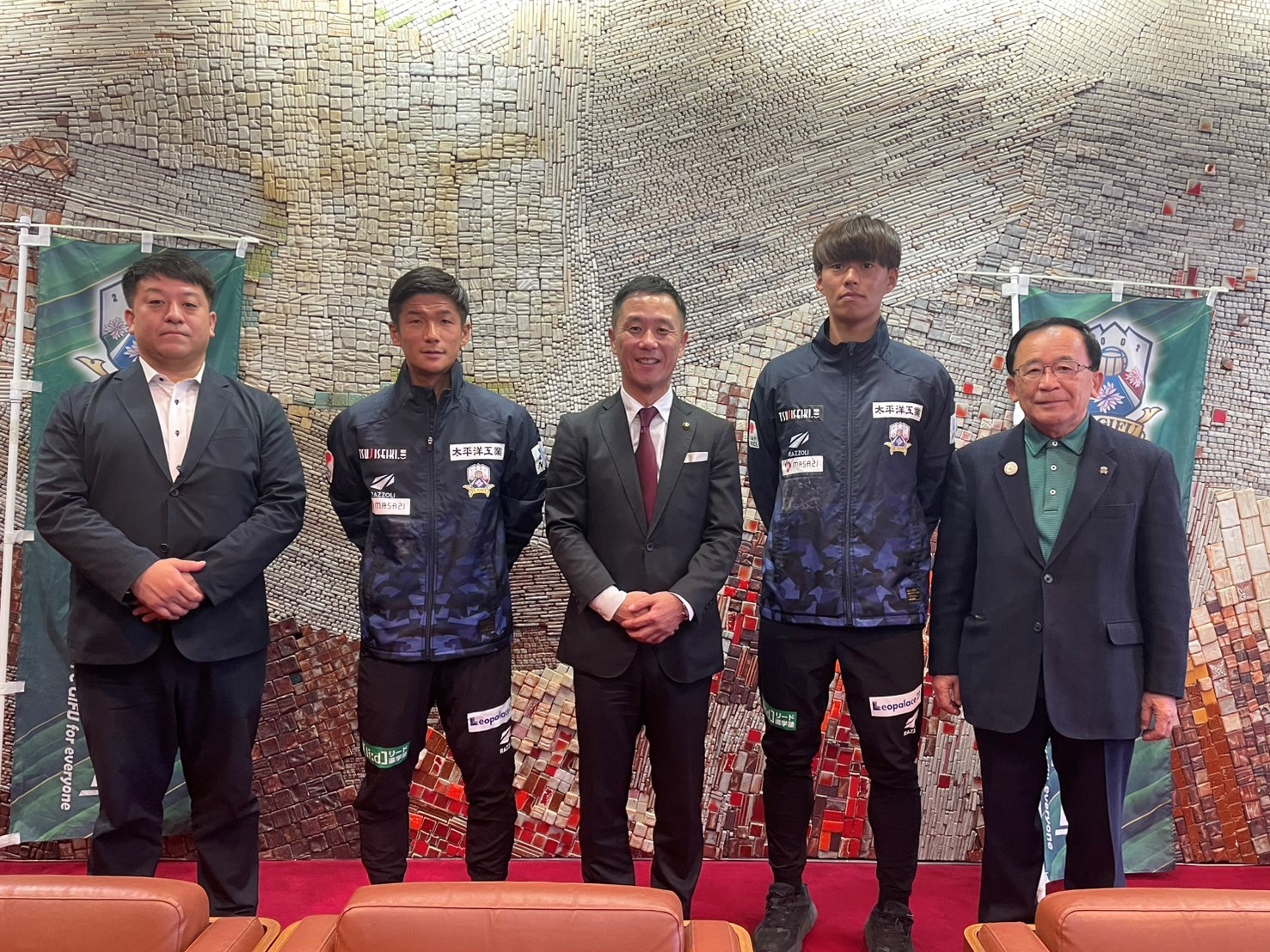 11月29日(土)FC大阪戦での「多治見市ホームタウンデー」開催にあたり、11月20日(木)に宮田博之会長、小松裕志社長、野澤陸選手、福田晃斗選手が多治見市を訪問し、髙木貴行多治見市長を表敬訪問しました。