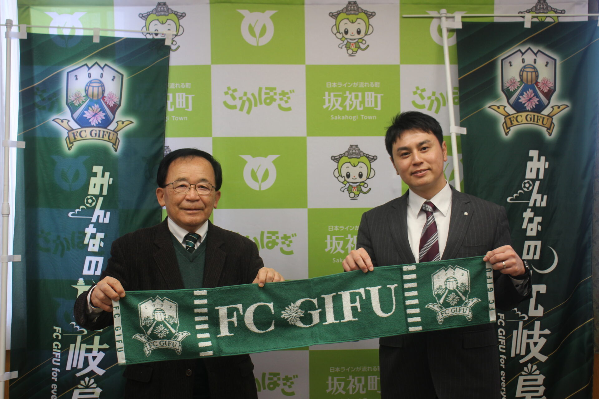 訪問では、日頃よりFC岐阜への温かいご支援・ご声援に対する御礼をお伝えするとともに、今後も坂祝町の皆さまに応援を頂きたいとのお願いをいたしました。
