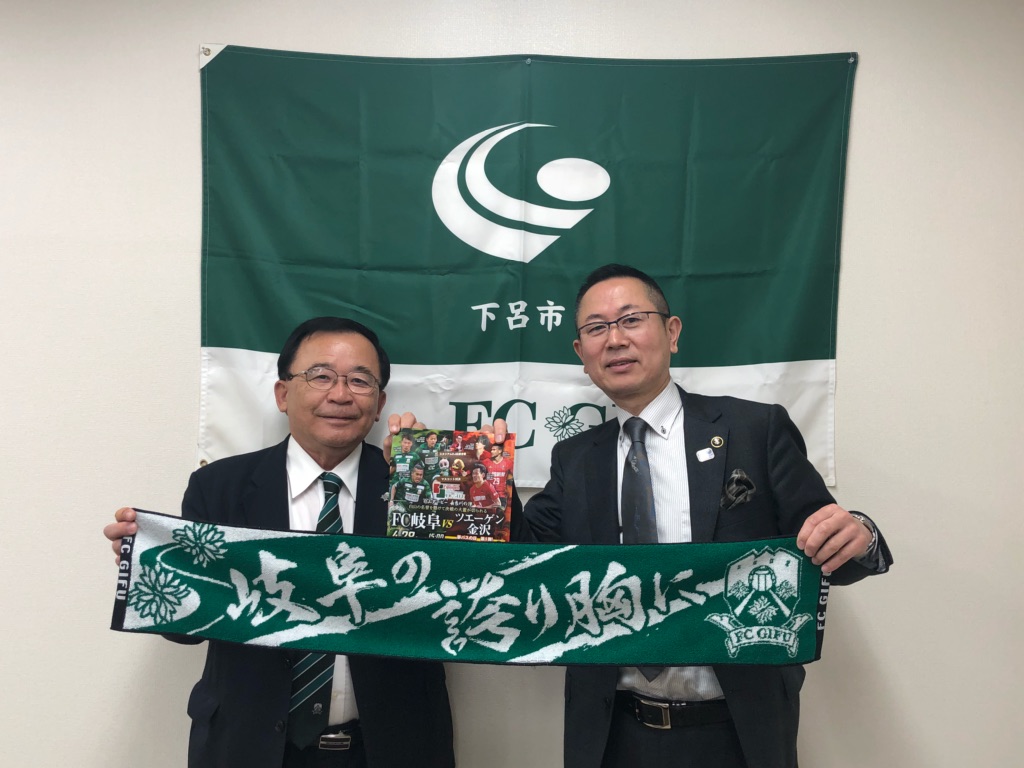 4月28日(土)ツエーゲン金沢戦(15時キックオフ) の「下呂市ホームタウンデー」開催にあたり、4月19日(木)下呂市役所にて、宮田社長が服部 秀洋 下呂市長を表敬訪問させて頂きました。