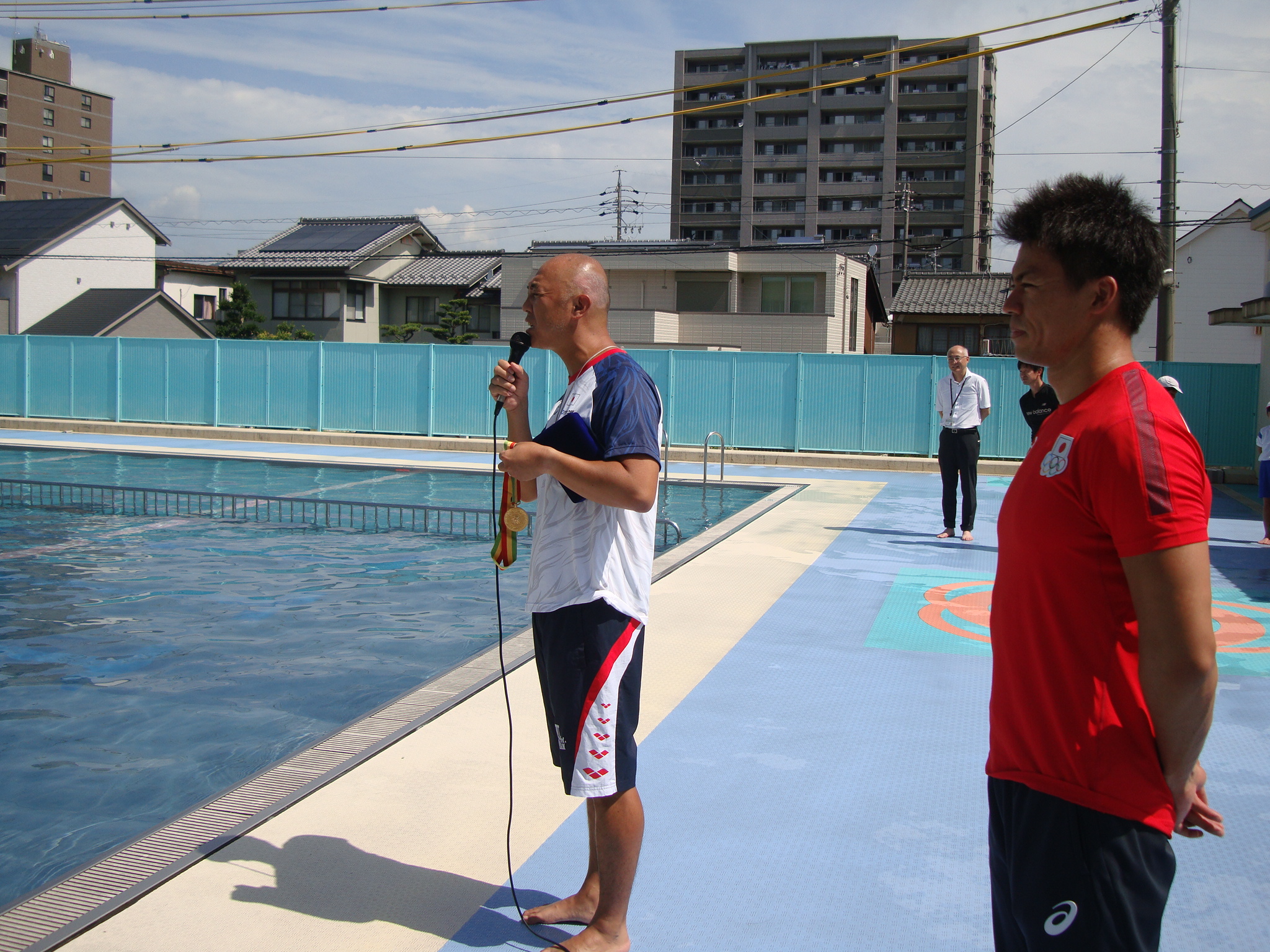 最後に糸井コーチから、「僕も小長谷選手も最初は、泳げなかったけれども、毎日練習を積み重ねることで、オリンピックにも出場することができました。皆さんも水泳を楽しんでください。」と子どもたちにメッセージが送られました。終了後は、小長谷選手と糸井コーチがハイタッチをして、子どもたちを見送りました。