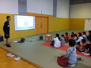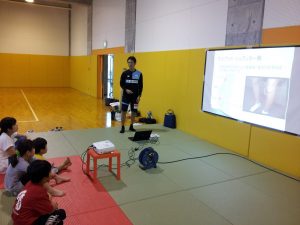 最初に大野トレーナーから、ストレッチの効果や子どもの時期に多いケガなどについて、分かりやすくお話ししました。成長期にある子どもたちならではのケガの話など、参加者の方もメモなどを取りながら、聞いていました。