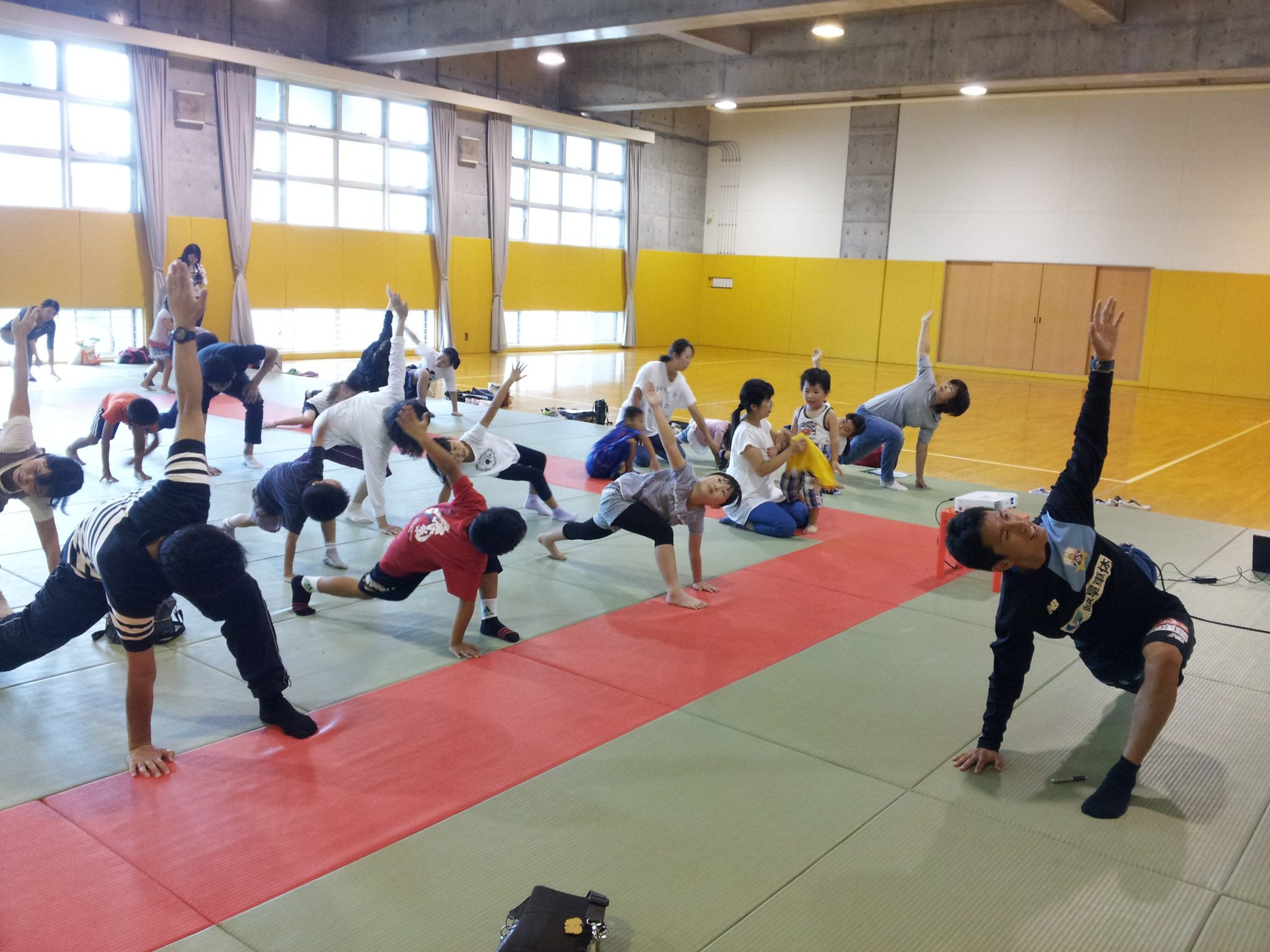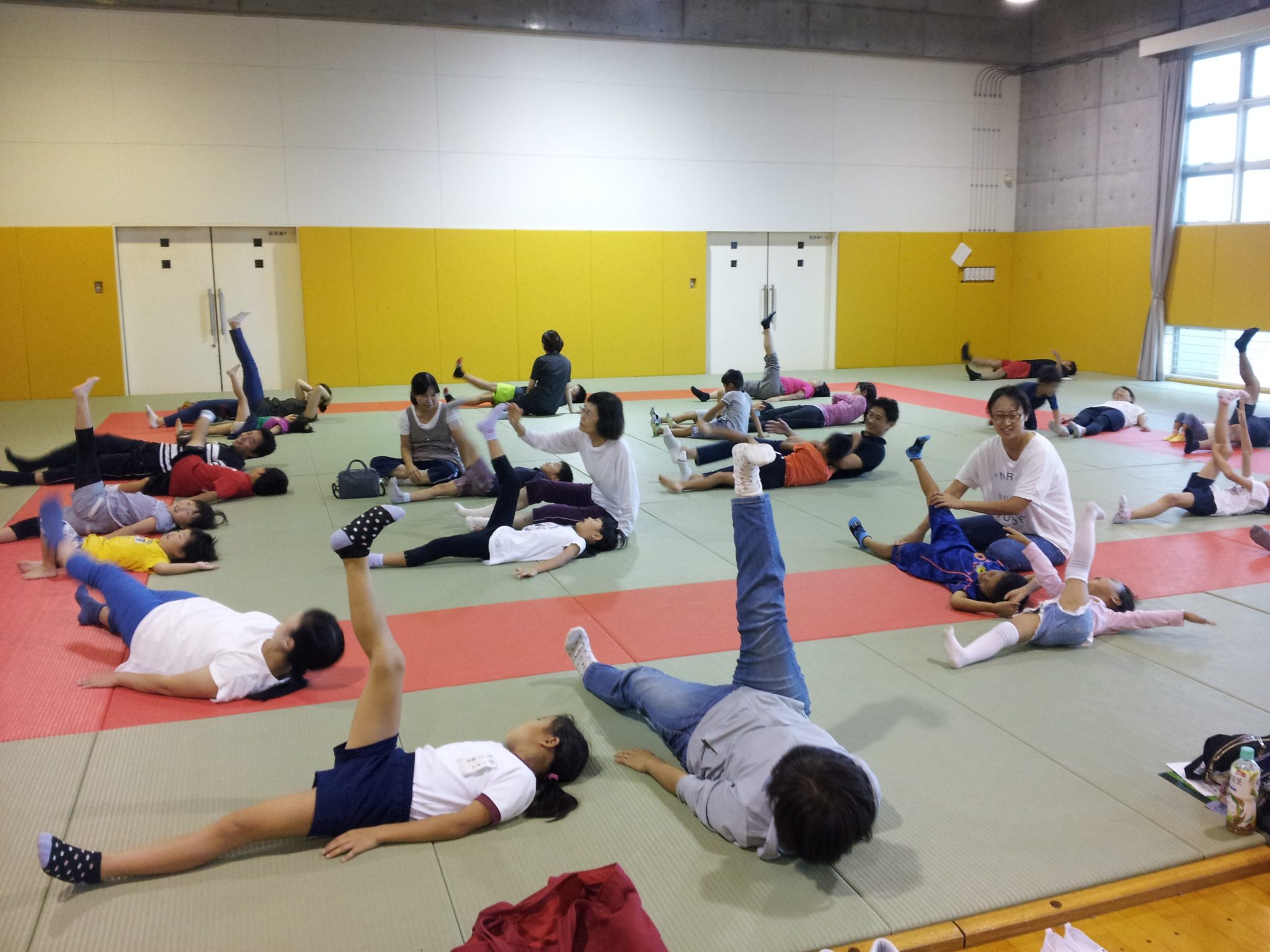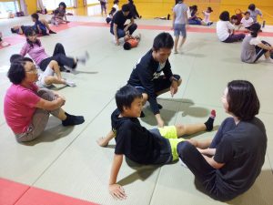 その後は、親子で柔軟性のチェックなどを行っていきました。参加者の中には柔軟性が低い方もおり、改めて自分の体を知る機会となりました。続けて、柔軟性を高めるようなストレッチを大野トレーナーと一緒に行っていきました。