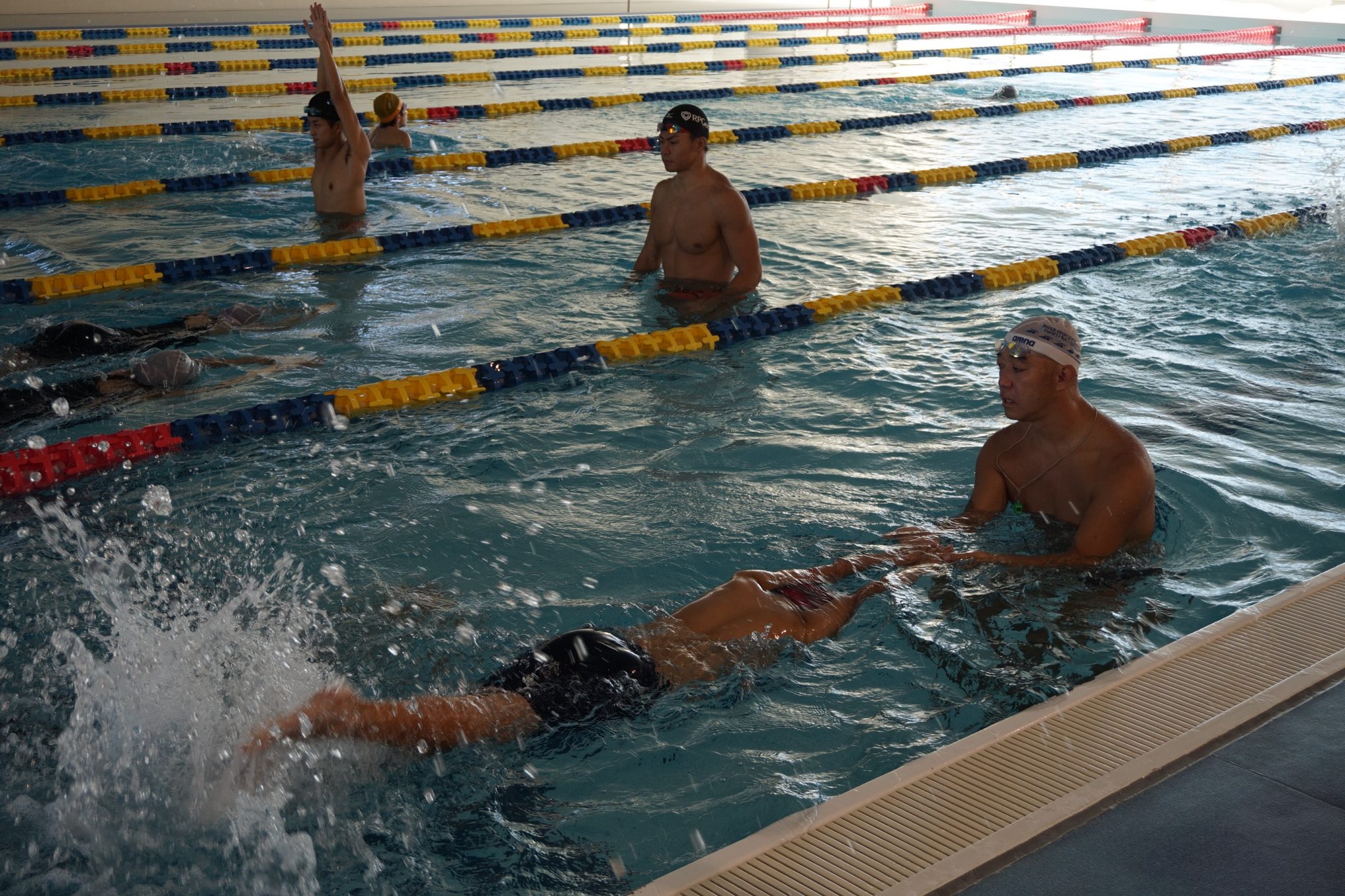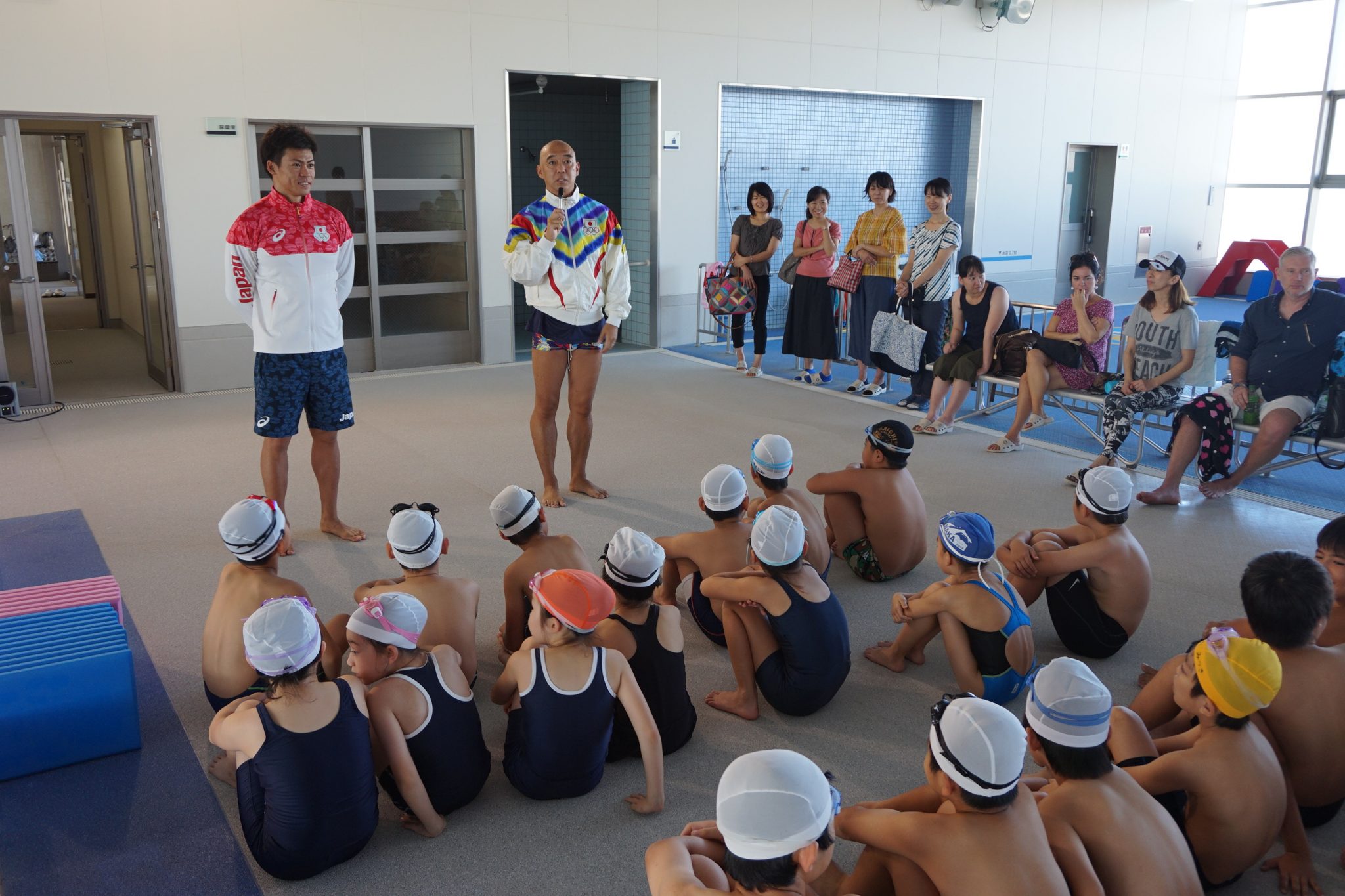 今回もリオオリンピック出場で現役選手の小長谷研二選手と同選手の指導をされている糸井統コーチにご協力をいただきました。また、岐阜聖徳学園大学水泳部の皆さんにもお手伝いをいただきました。