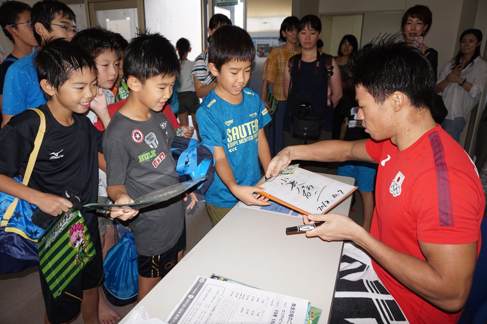 最後に小長谷選手と糸井コーチのサイン会と写真撮影を行い、子どもたちもたくさんサインを貰っていました。この教室から、将来の水泳選手が生まれれば嬉しい限りです。また東京オリンピックに向けて、小長谷研二選手を応援して頂ければと思います。