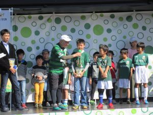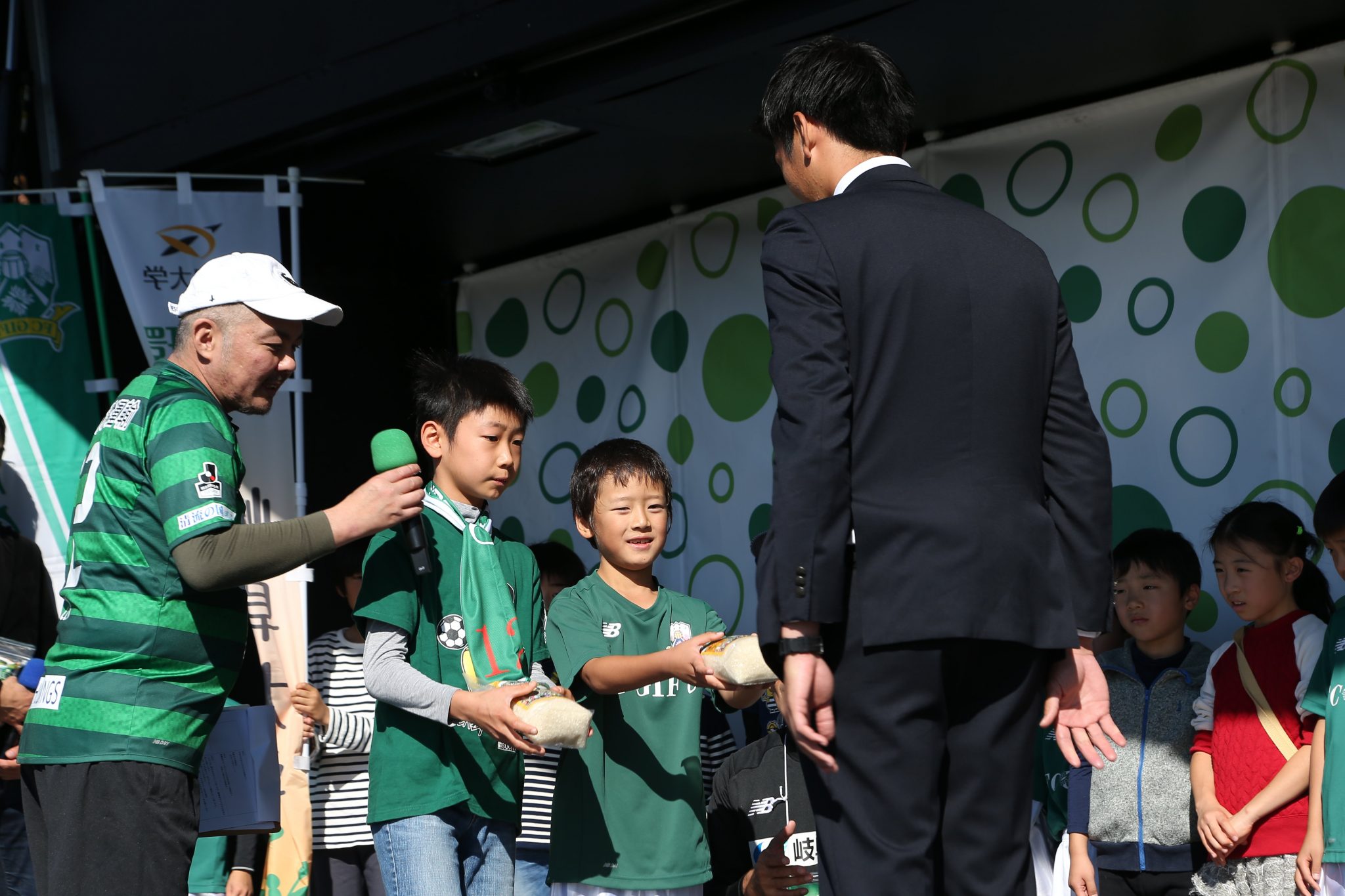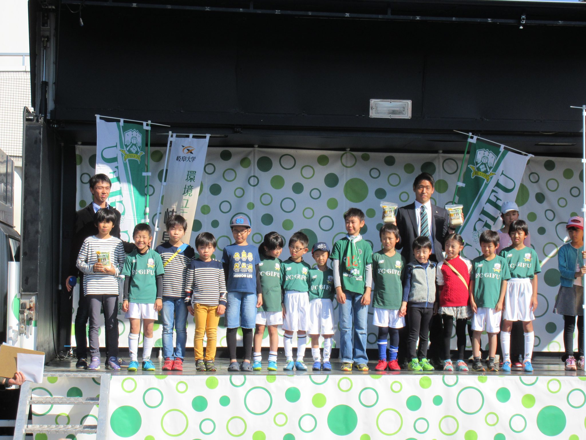 贈呈式は、FC岐阜ホームゲーム最終戦前のCCNステージカー上で行われ、田植えや稲刈りに参加した岐阜大学付属小学校の児童、FC岐阜スクール生、岐阜大学職員が参加しました。