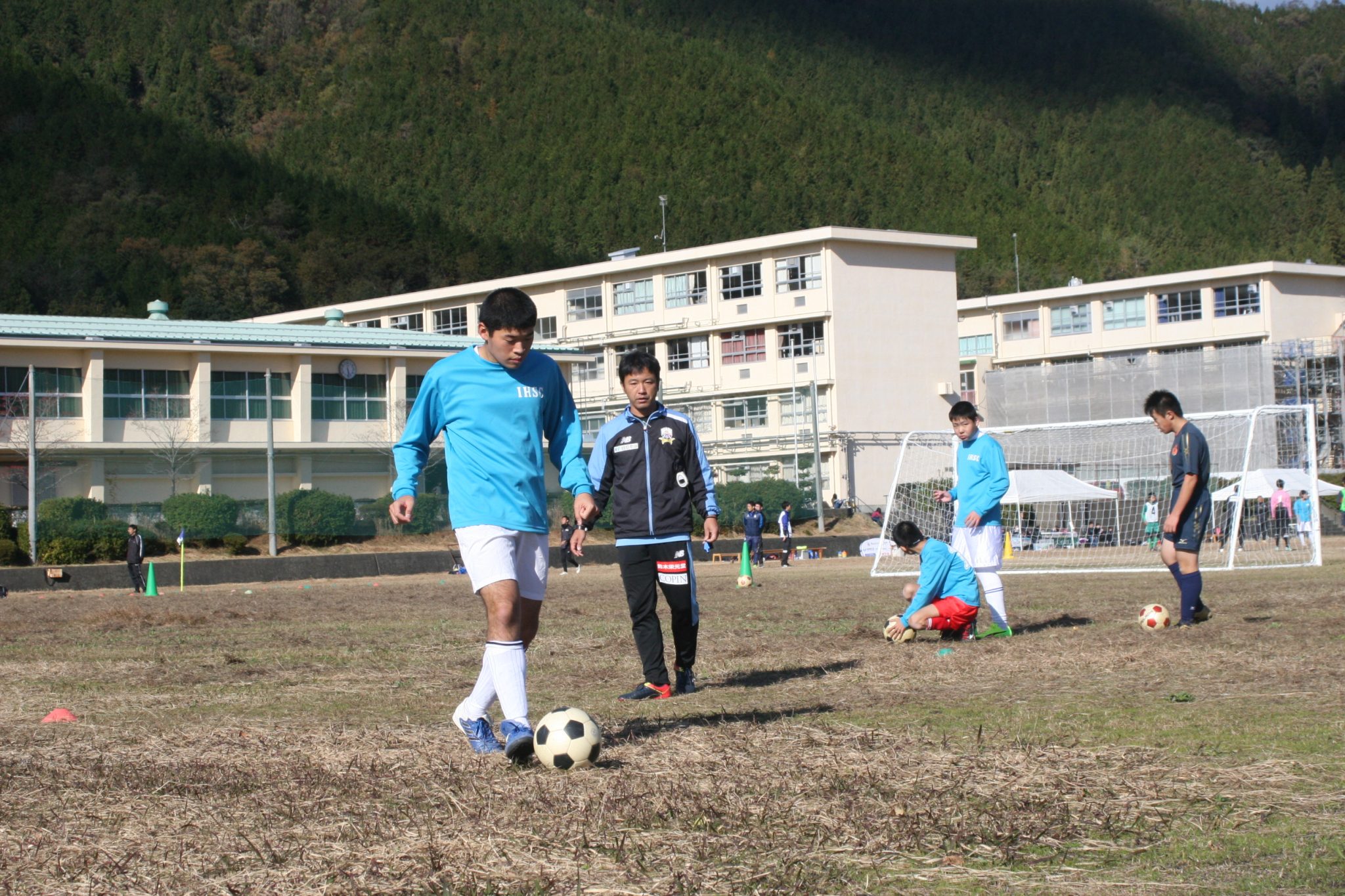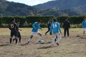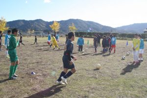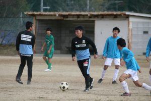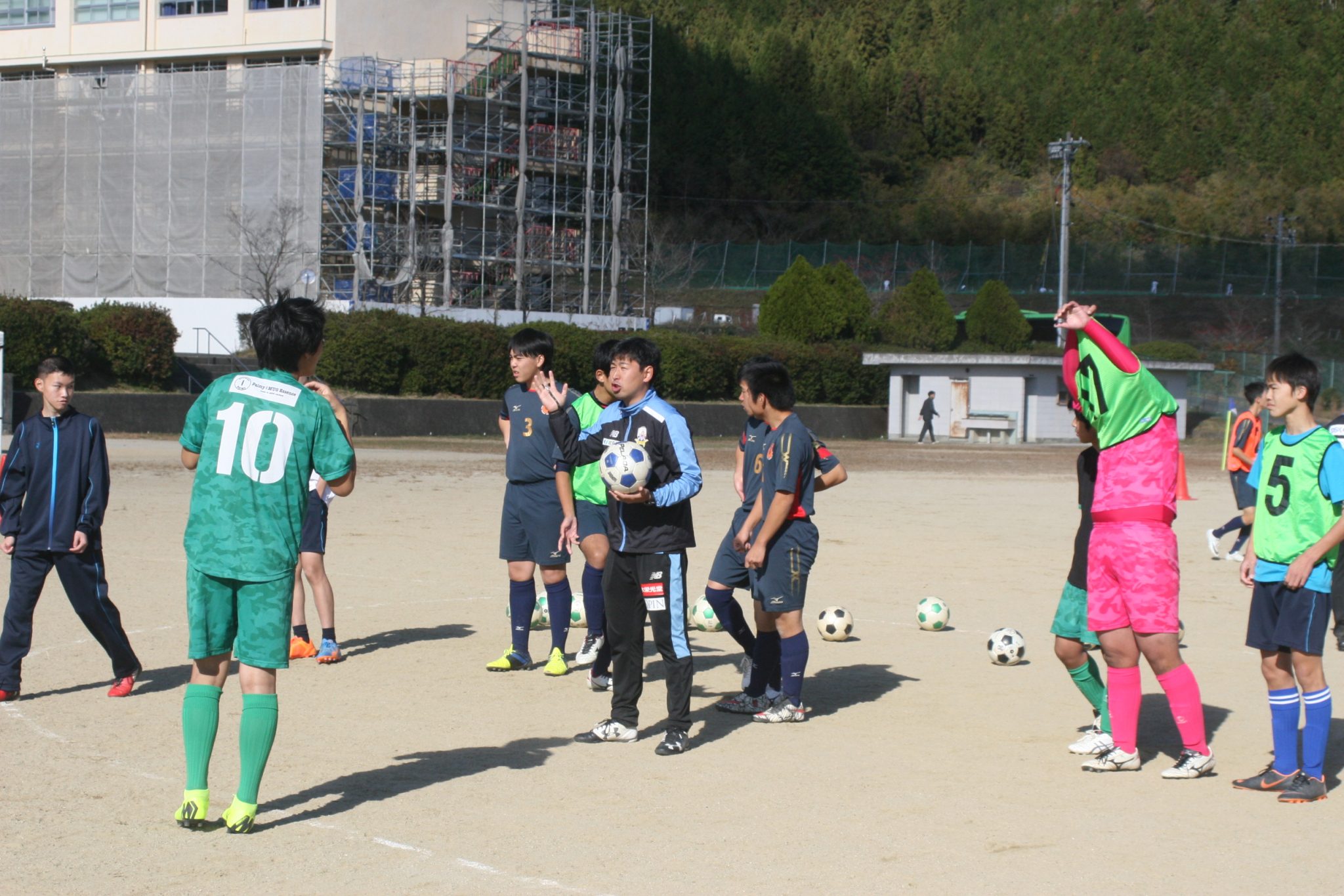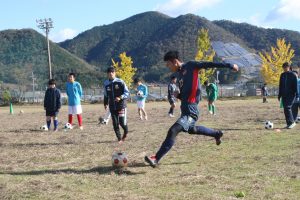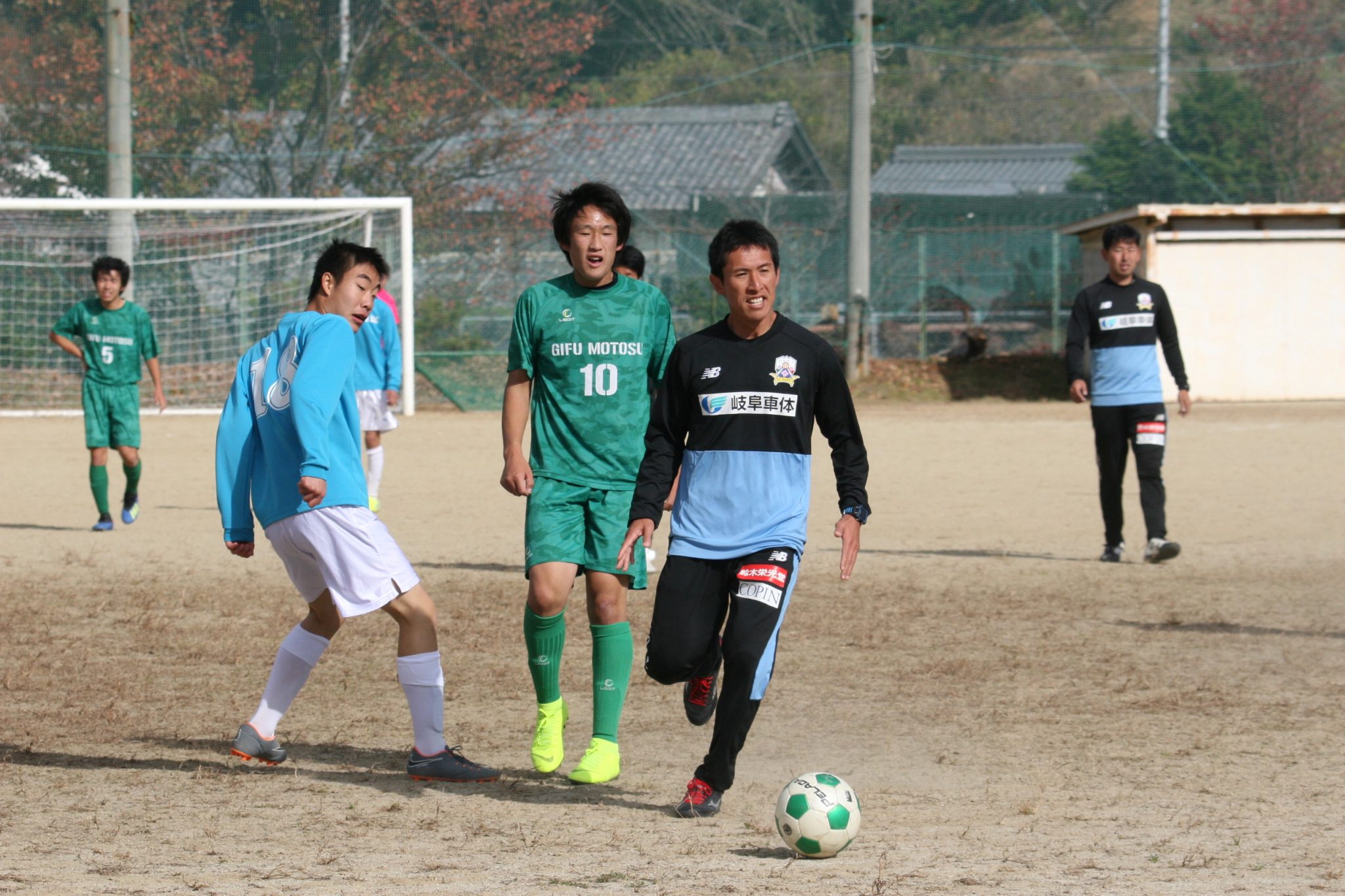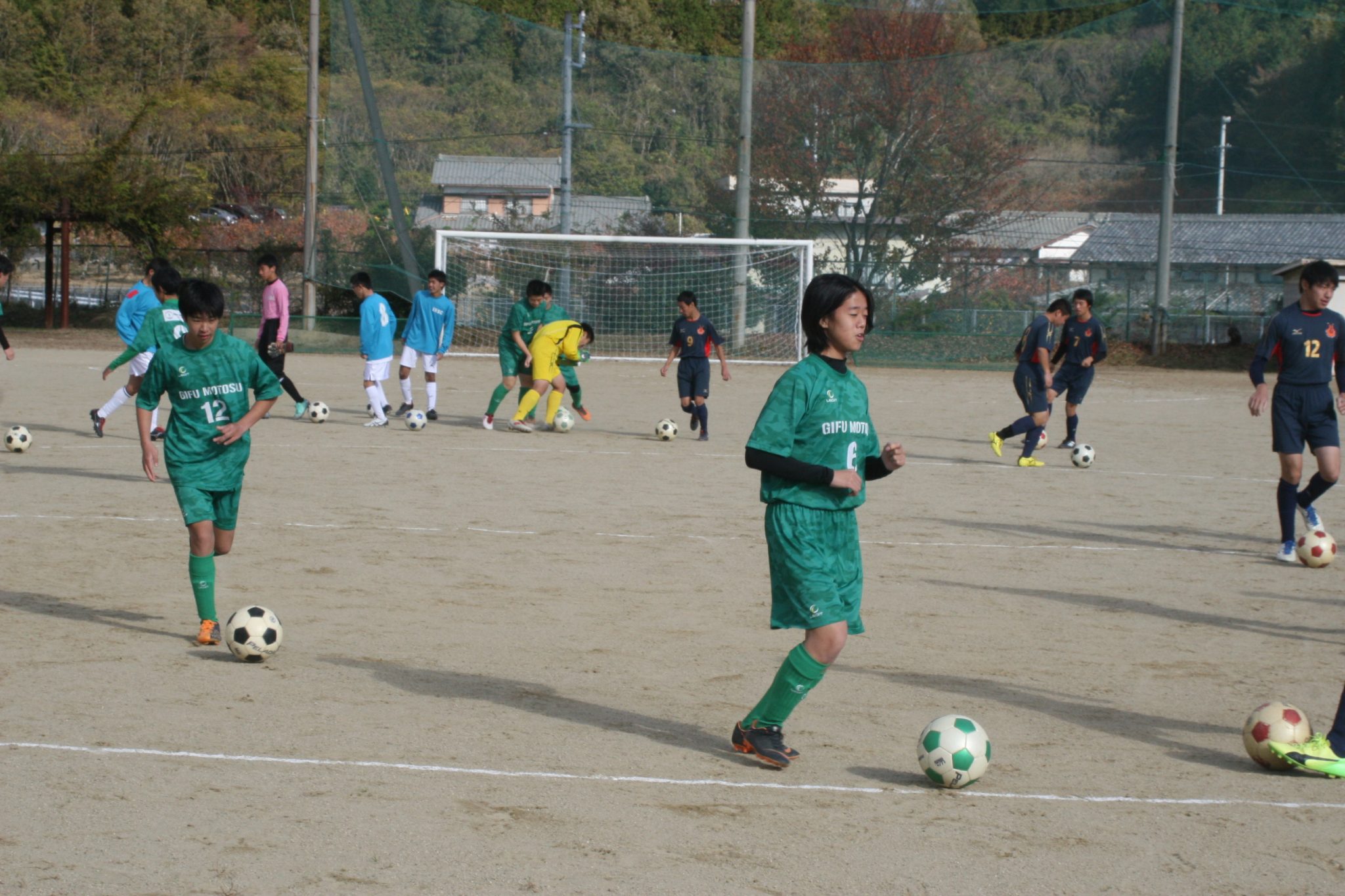 最後に2コートに分かれて、各校との交流試合を行っていきました。今回は、各チームにFC岐阜のコーチが1名ずつ入り、試合の中でコーチングをしていきました。どのチームも勝利を目指して真剣にプレーする姿が見られ、熱い試合が見られました。