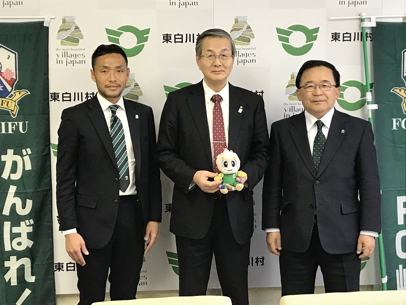 3月9日(土)ファジアーノ岡山戦(15時キックオフ) の「東白川村ホームタウンデー」開催にあたり、2月28日(木)東白川村役場にて、宮田 博之 社長と難波 宏明 クラブアンバサダーが、今井 俊郎 東白川村長を表敬訪問させて頂きました。