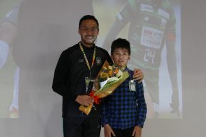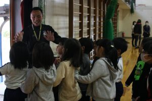 鷺山小学校の生徒を代表して、6年生の中西くんから難波クラブアンバサダーに花束が贈呈され、全校集会は終了となりました。子どもたちが退場するときには、難波クラブアンバサダーがハイタッチで見送り、子どもたちに声をかけていました。