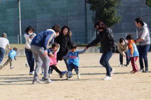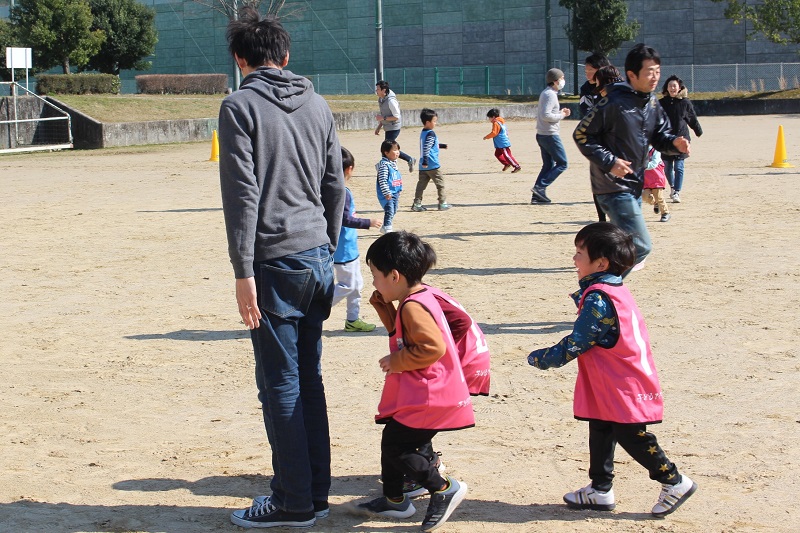 親子で手をしっかり握りしめ、お父さんお母さんを引っ張る姿も見られ積極的にプレー出来ました。