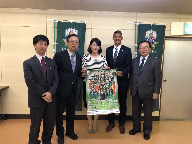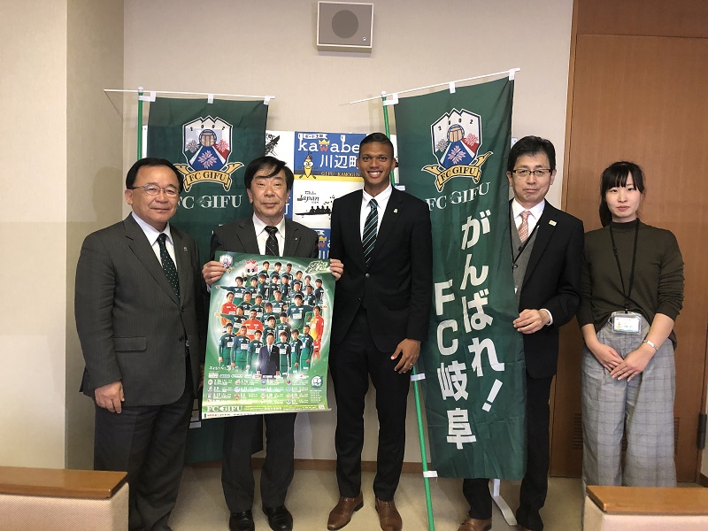 (写真左から、FC岐阜 宮田 博之 社長、佐藤 光宏 川辺町長、ライアン選手)