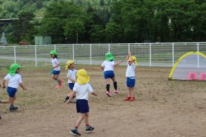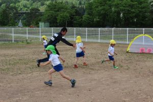必死で鬼役のコーチから逃げます!バナナになったお友達の皮をむいてあげ、助け合う姿がたくさんありました。