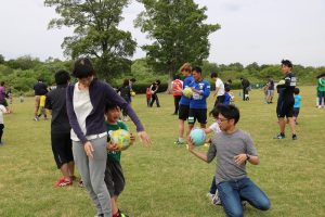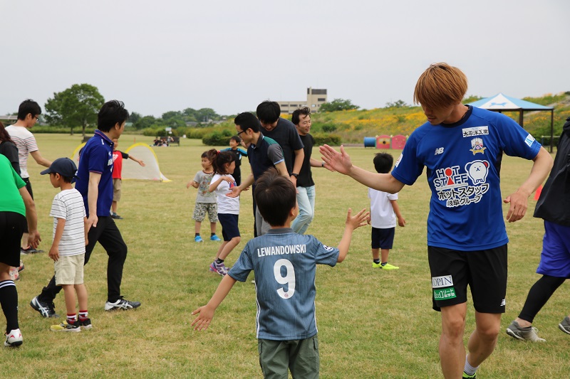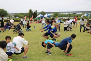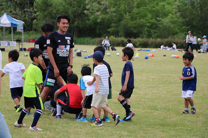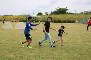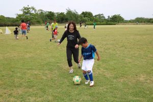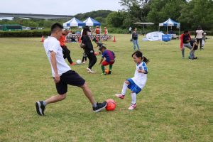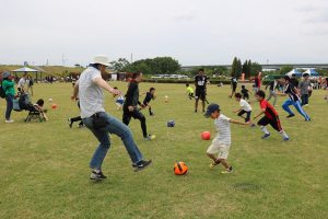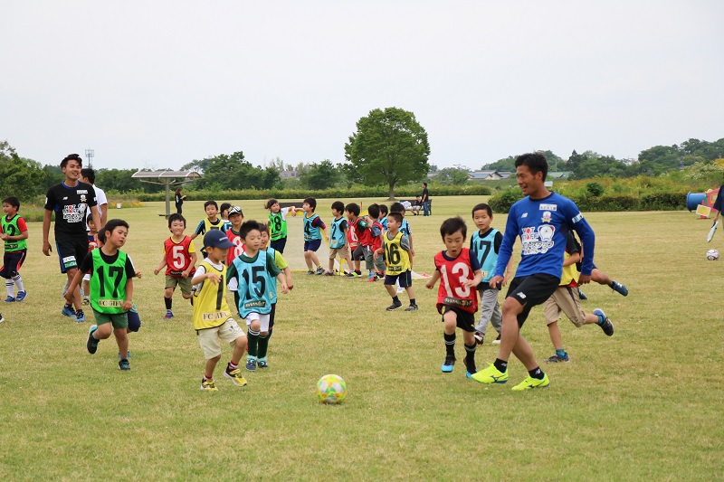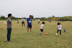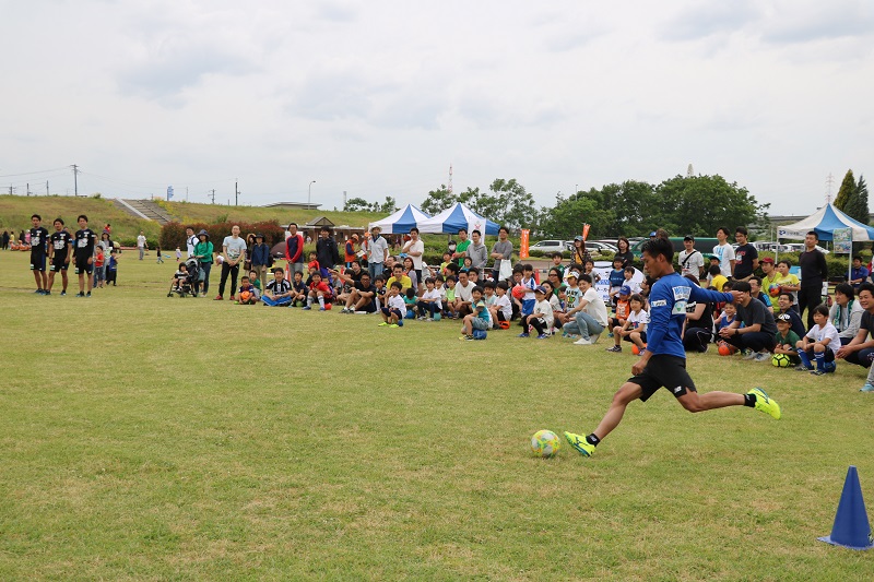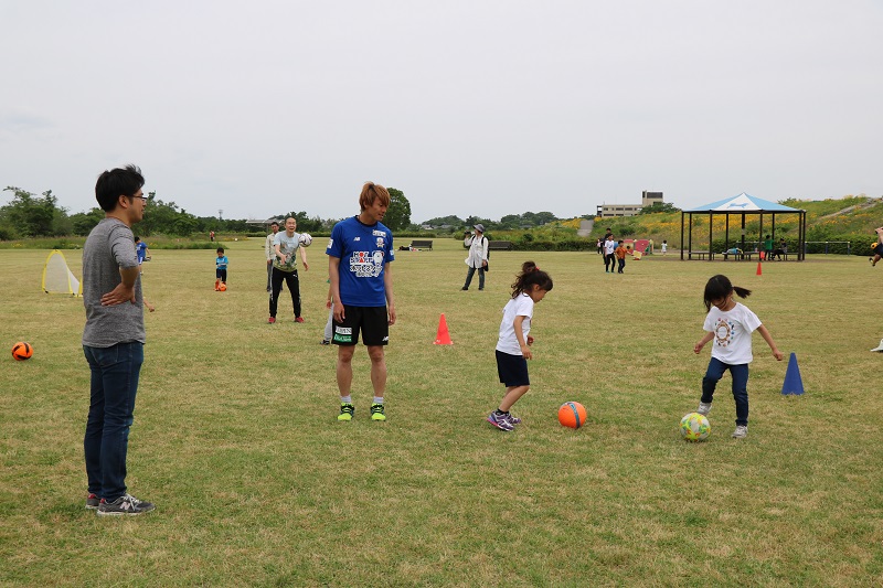 5月18日(土)各務原市にある国営木曽三川公園かさだ広場にて、木曽三川公園管理センター主催の親子サッカー教室が開催され、1、2年生の親子53組が参加しました。