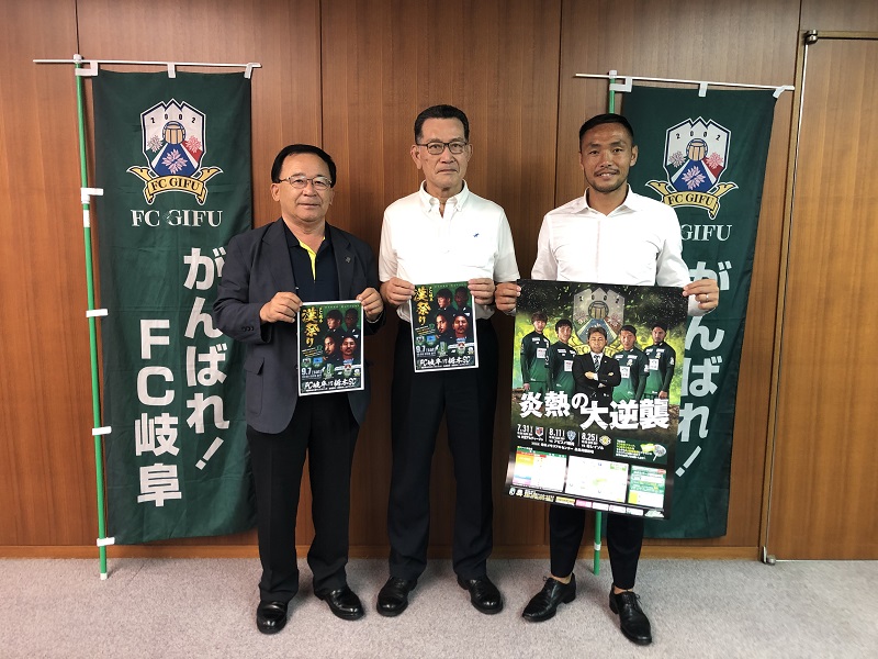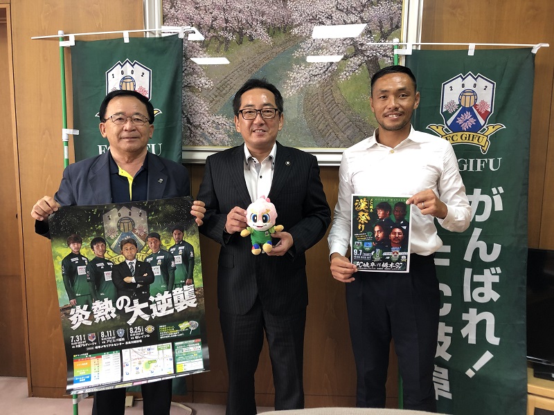 9月7日(土)栃木SC戦(19時キックオフ) の「各務原市ホームタウンデー」開催にあたり、8月22日(木)各務原市役所にて、宮田 博之 社長と難波 宏明 クラブアンバサダーが、浅野 健司 各務原市長を表敬訪問させて頂きました。