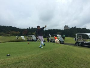 皆さん、ティーキックを思いきりキックしていきます。なかにはボールが止まらずOBとなってしまう方もいましたがそれも面白いところです。