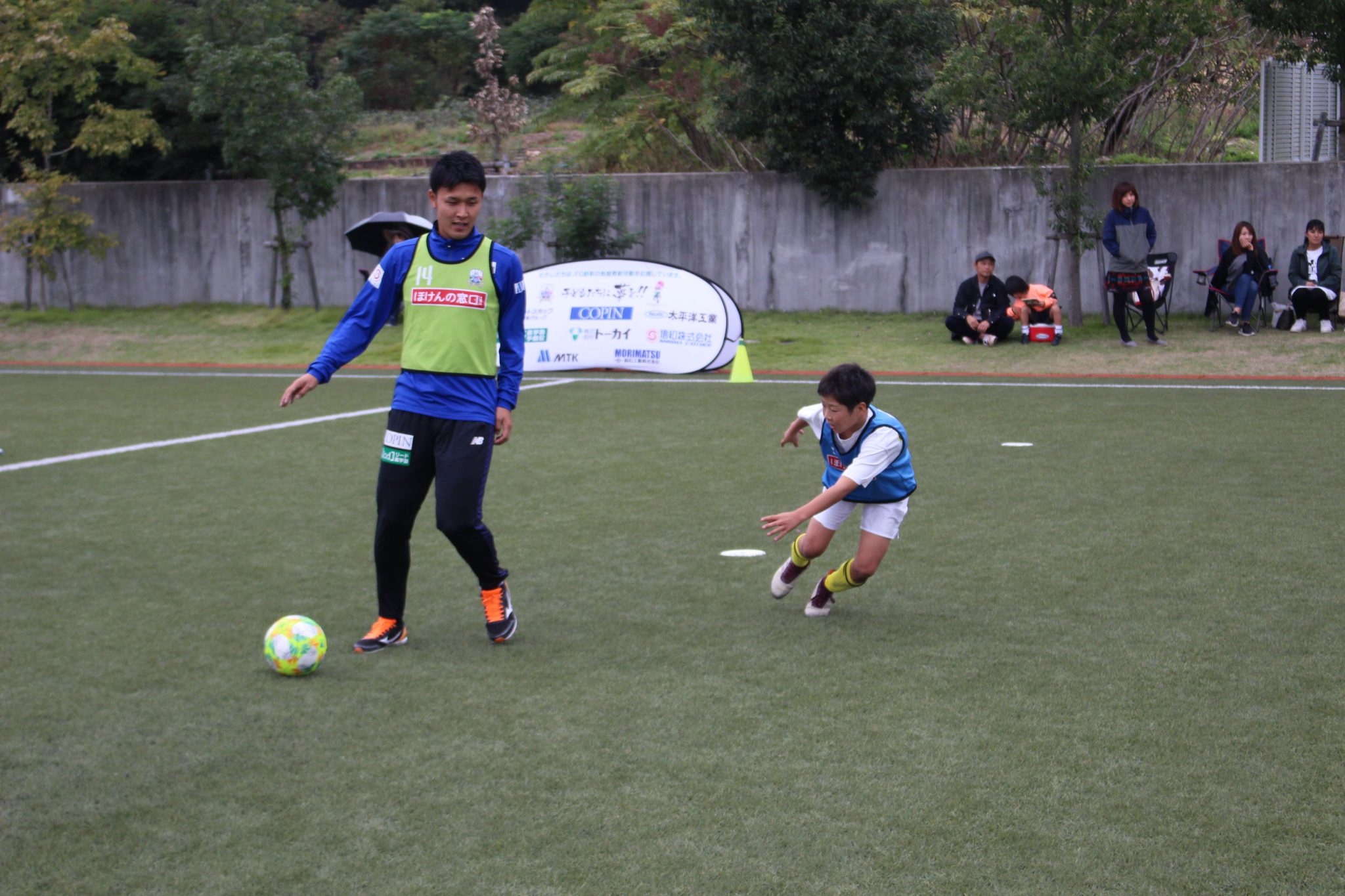 徐々に距離を広げながら行うパスとトラップの練習では、三島選手と益山コーチがみんなの前でデモンストレーションを披露し、正確なトラップとパスに子ども達から歓声が上がっていました。