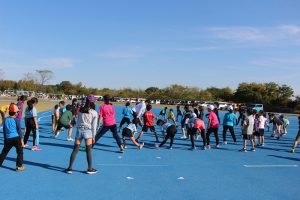 始めに和戸選手の真似をしながらジョギングをしました。怪我予防のためにしっかりストレッチもしました。