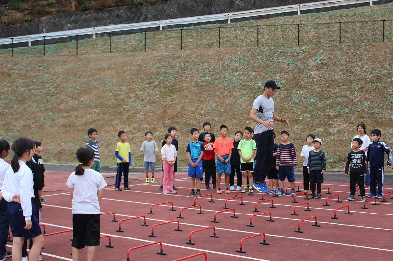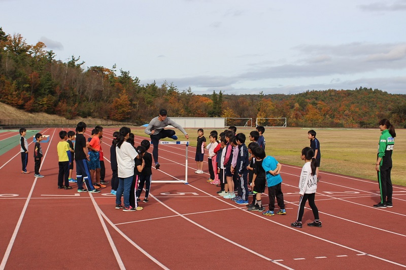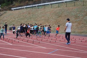 まずは恒例となっている和戸選手の専門とする110mHのデモンストレーションを見せてもらいました。子ども達に分かりやすいように「ゆっくり高く」「ハードルすれすれ」など解説入りで何度も披露してくれました。