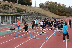 和戸選手の真似をしながらジョギングをしました。階段を使ったり競技場の特徴を活かしながら、色んな動きをしてウォーミングアップ!そしてバランスチェックでは足の切り替えトレーニングも行いました。