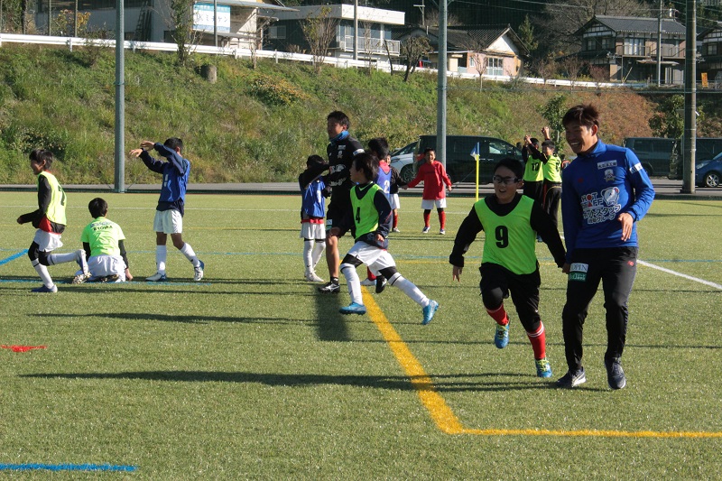 粟飯原選手と「手つなぎオニ」で楽しくウォーミングアップしたり、「キック」のトレーニングをおこないました。