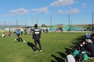 最後は会津選手も守備に入り、原田選手と一緒にゴールを守ります。楽しく交流しました。